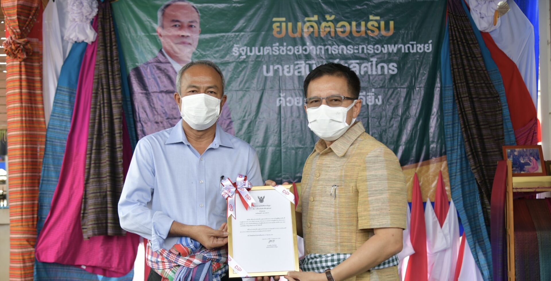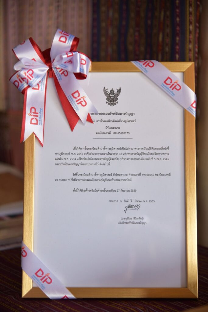 นายสินิตย์ เลิศไกร รัฐมนตรีช่วยว่าการกระทรวงพาณิชย์ เป็นประธานมอบหนังสือการขึ้นทะเบียนสิ่งบ่งชี้ทางภูมิศาสตร์ “ผ้าไหมสาเกต” แก่นายภูสิต สมจิตต์ ผู้ว่าราชการจังหวัดร้อยเอ็ด โดยกรมฯ ได้ขึ้นทะเบียน GI ไทย เมื่อวันที่ 7 มีนาคม 65 ที่ผ่านมา โดยนำคณะผู้บริหารและเจ้าหน้าที่กรมทรัพย์สินทางปัญญาตรวจเยี่ยมแหล่งผลิตสินค้าGI “ผ้าไหมสาเกต” ซึ่งปัจจุบันมีการรวมกลุ่มผู้ประกอบการและกลุ่มวิสาหกิจชุมชนในจังหวัด 19 กลุ่ม สามารถผลิตสินค้าพื้นบ้านกว่า 15,000 ผืน/ปี ในราคาจำหน่าย 1,800 – 2,500 บาท/ผืน สร้างรายได้ให้กับชุมชนไม่น้อยกว่า 27 ล้านบาท/ปี