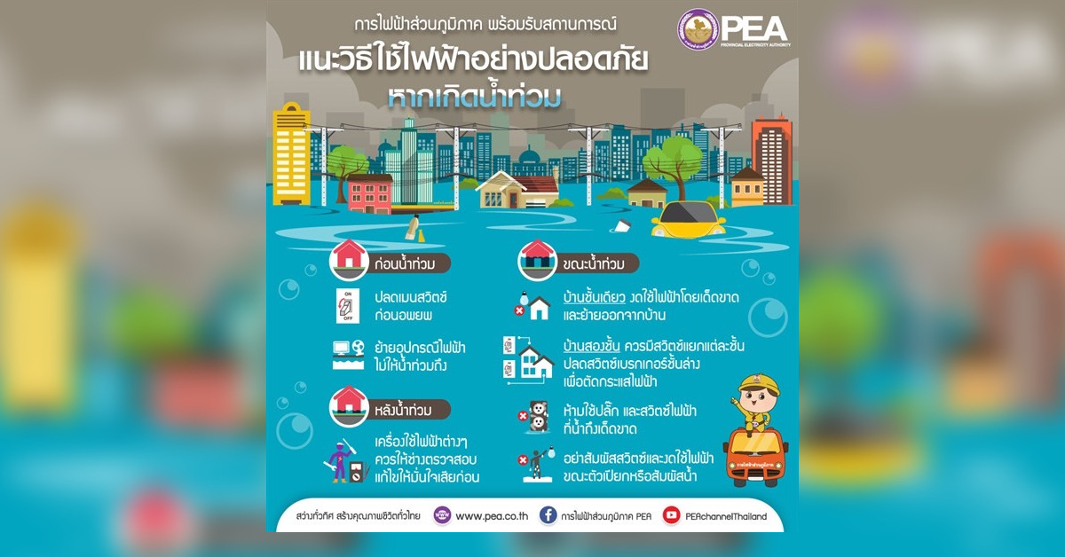 การไฟฟ้าส่วนภูมิภาค (PEA) ขอให้ประชาชนติดตามข่าวสารสภาพอากาศ ประกาศเตือนจากหน่วยงานภาครัฐและหน่วยงานที่เกี่ยวข้องอย่างใกล้ชิด เพื่อเตรียมพร้อมรับสถานการณ์น้ำท่วมทุกขณะและมีข้อแนะนำประชาชนเกี่ยวกับไฟฟ้า กรณีเกิดน้ำท่วมหรือน้ำท่วมขัง เพื่อความปลอดภัยในชีวิต ดังนี้