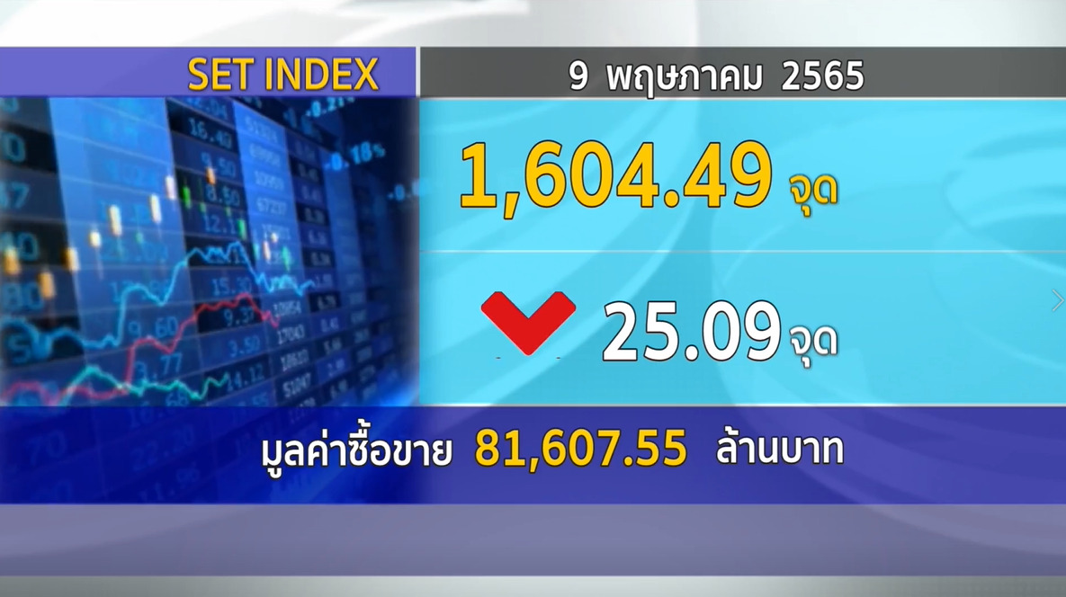 กทม. 9 พ.ค.-ตลาดหลักทรัพย์ ปิดวันนี้ที่ระดับ 1,604.49 จุด ลดลง 25.09 จุด (-1.54%) มูลค่าการซื้อขาย 81,607.55 ล้านบาท ตลาดหุ้นไทยวันนี้ปรับตัวลงตามภูมิภาค ยังกังวลเฟด