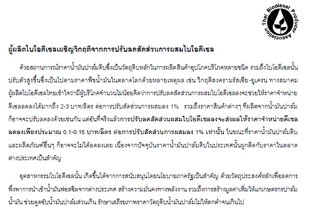 สมาคมผู้ผลิตไบโอดีเซลไทย ออกแถลงการณ์ ว่า ด้วยสถานการณ์ราคาน้ำมันปาล์มดิบซึ่งเป็นวัตถุดิบหลักในการผลิตสินค้าอุปโภคบริโภคหลายชนิด รวมถึงไบโอดีเซลนั้นปรับตัวสูงขึ้นซึ่งเป็นไปตามราคาพืชน้ำมันในตลาดโลกด้วยหลายเหตุผล เช่น วิกฤติสงครามรัสเซีย-ยูเครน ทางสมาคมผู้ผลิตไบโอดีเซลไทยเข้าใจว่ามีผู้บริโภคจำนวนไม่น้อยคิดว่าการปรับลดสัดส่วนการผสมไบโอดีเซลลงจะช่วยให้ราคาจำหน่ายดีเซลลดลงได้มากถึง 2-3 บาท/ลิตร ต่อการปรับสัดส่วนการผสมลง 1% รวมถึงราคาสินค้าต่างๆ ที่ผลิตจากน้ำมันปาล์มก็อาจจะปรับลดลงด้วยเช่นกัน แต่อันที่จริงแล้วการปรับลดสัดส่วนผสมไบโอดีเซลลงจะส่งผลให้ราคาจำหน่ายดีเซลลดลงเพียงประมาณ 0.1-0.15 บาท/ลิตร ต่อการปรับสัดส่วนการผสมลง 1% เท่านั้น ในขณะที่ราคาน้ำมันปาล์มดิบและผลิตภัณฑ์อื่นๆ ก็อาจจะไม่ได้ลดลงเลย เนื่องจากปัจจุบันราคาน้ำมันปาล์มดิบในประเทศนั้นผูกติดกับราคาในตลาดต่างประเทศเป็นสำคัญ