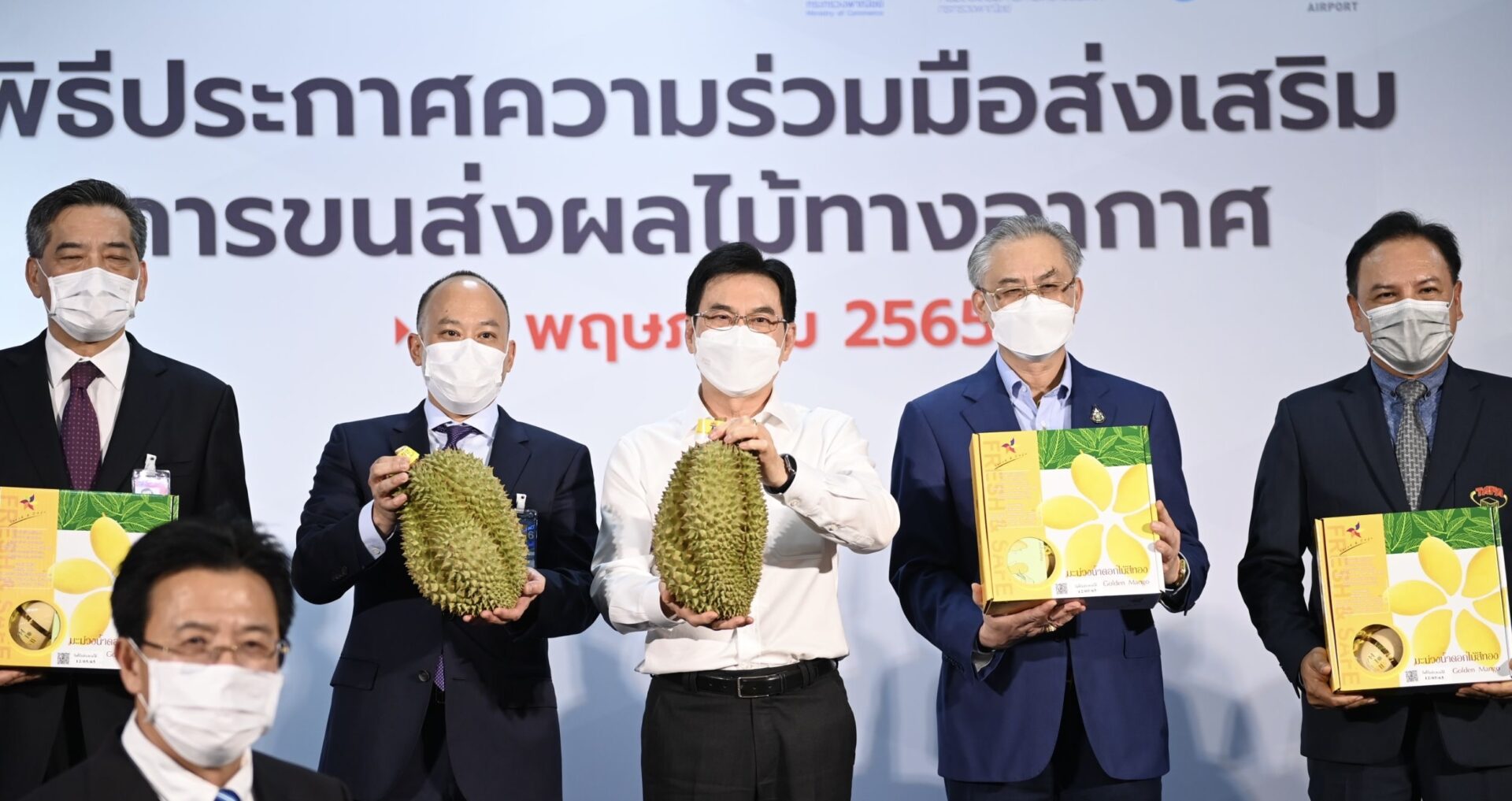 นายจุรินทร์ ลักษณวิศิษฏ์ รองนายกรัฐมนตรีและรัฐมนตรีว่าการกระทรวงพาณิชย์แถลงถึงความร่วมมือระหว่างกรมส่งเสริมการค้าระหว่างประเทศ สมาคมตัวแทนขนส่งสินค้าทางอากาศไทย สมาพันธ์ผู้ให้บริการโลจิสติกส์ไทยและบริษัทการบินไทยจำกัด(มหาชน)ในการส่งเสริมการส่งออกผลไม้ทางอากาศ ที่อาคารขนถ่ายสินค้า บริษัท การบินไทยจำกัด(มหาชน) ท่าอากาศยานสุวรรณภูมิจังหวัดสมุทรปราการ