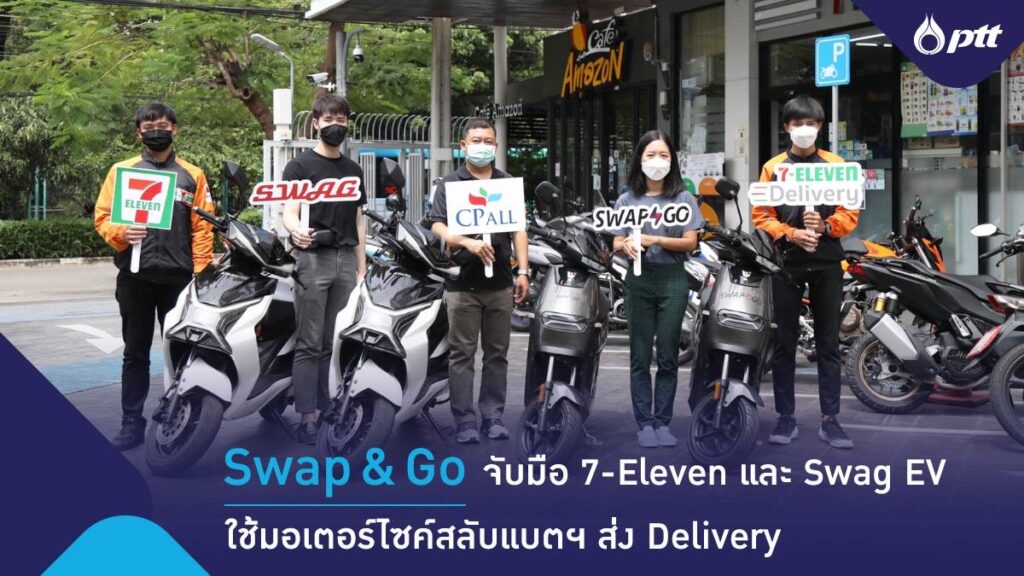 ด้าน บมจ.ปตท.แจ้งว่า นางสาวอาวีมาศ สิริแสงทักษิณ กรรมการผู้จัดการ บริษัท สวอพ แอนด์ โก จำกัด (Swap & Go) พร้อมด้วยนายกิติพงษ์ เนียมนัด ผู้จัดการฝ่ายพัฒนางานวิศวกรรม บริษัท ซีพี ออลล์ จํากัด (มหาชน) (CP ALL) และนายกันตินันท์ ตันวีนุกูล ผู้ก่อตั้งและกรรมการบริหาร (ประเทศไทย) บริษัท ซแว็ก อีวี จำกัด (SWAG EV) ส่งมอบจักรยานยนต์ไฟฟ้าสลับ หรือ “สวอพ” แบตเตอรี่ได้ แบบไม่ต้องรอชาร์จ สำหรับให้บริการส่งสินค้า Delivery ของร้าน7-Eleven ซึ่งปัจจุบันได้นำร่องใช้งานไปแล้วกว่า 30 สาขาในกรุงเทพฯ โดย CP ALL ตั้งเป้าหมายการใช้รถจักรยานยนต์ไฟฟ้าสำหรับ 7-Delivery ให้ได้ถึง 1,000 สาขา ในปี 2566 ทั้งนี้ Swag EV บริษัทผู้ผลิตและจัดจำหน่ายรถจักรยานยนต์ไฟฟ้าชั้นนำ ได้ร่วมส่งมอบรถจักรยานยนต์ไฟฟ้าที่พัฒนาให้สามารถใช้งานสลับแบตเตอรี่ในระบบของ Swap & Go มาทดลองใช้งานจริงอีกด้วย ความร่วมมือนี้ เป็นการเตรียมความพร้อมในการเพิ่มจำนวนการใช้งานรถจักรยานยนต์ไฟฟ้าในประเทศไทยผ่านการสร้างพันธมิตรทางธุรกิจ ร่วมขับเคลื่อนและเพิ่มศักยภาพการใช้พลังงานสะอาดของประเทศ สู่การสร้างสรรค์นวัตกรรมพลังงานอนาคตอย่างยั่งยืน