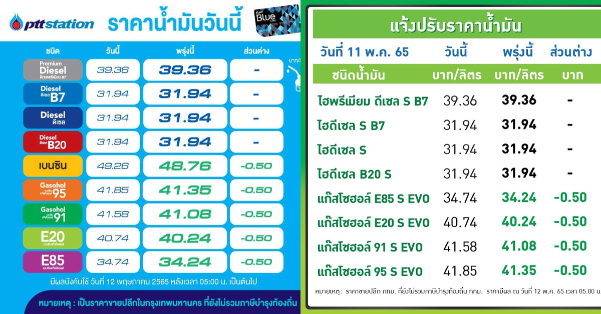 โดยราคาขายปลีก PTT Station จะเป็นดังนี้ ULG = 48.76, GSH95 = 41.35, E20 = 40.24, GSH91 = 41.08, E85 = 34.24, HSD- B7= 31.94, HSD-B10 = 31.94, HSD-B20=31.94,ดีเซลพรีเมี่ยม B7 = 39.36 บาทต่อลิตร โดยราคาขายปลีกข้างต้นยังไม่รวมภาษีบำรุงกรุงเทพมหานคร