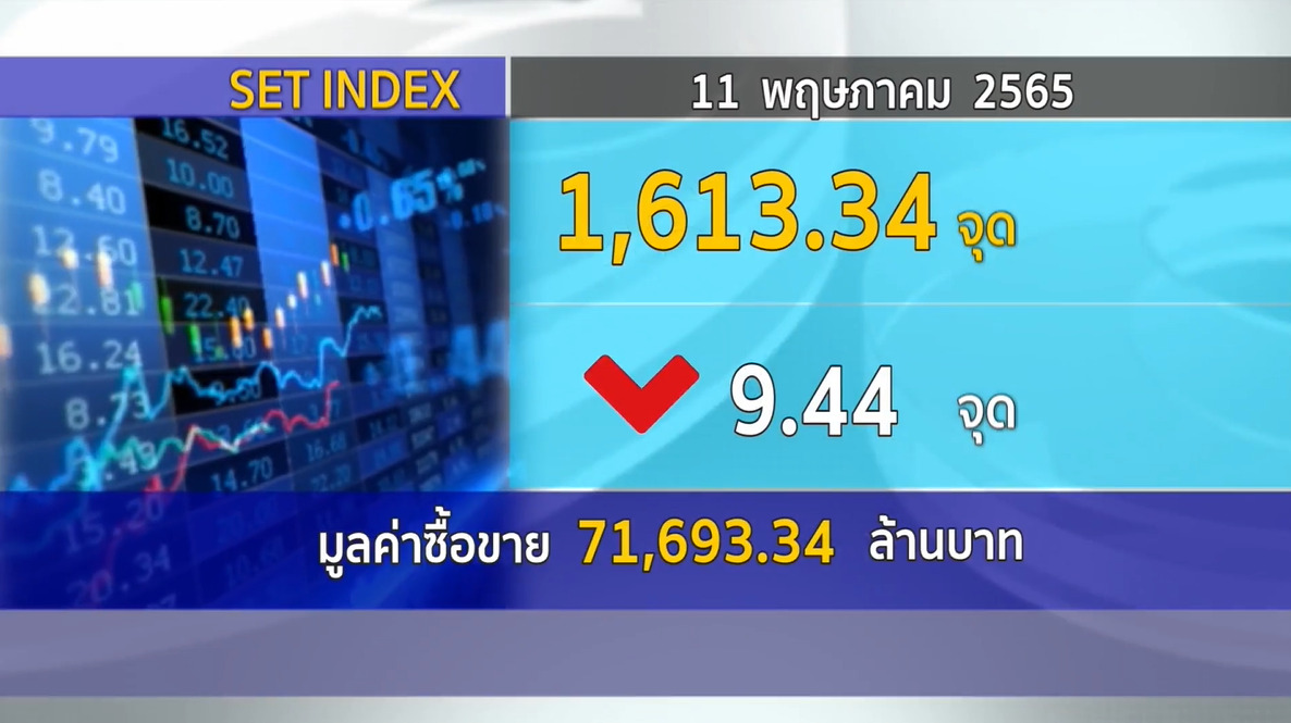 กทม. 11 พ.ค.-ตลาดหลักทรัพย์ ปิดวันนี้ที่ระดับ 1,613.34 จุด ลดลง 9.44 จุด (-0.58%) มูลค่าการซื้อขาย 71,693.34 ล้านบาท หุ้นไทยวันนี้แกว่งตัวในแดนลบ นักลงทุนเลือกขายลดความเสี่ยงระหว่างรอติดตามตัวเลขเงินเฟ้อสหรัฐ