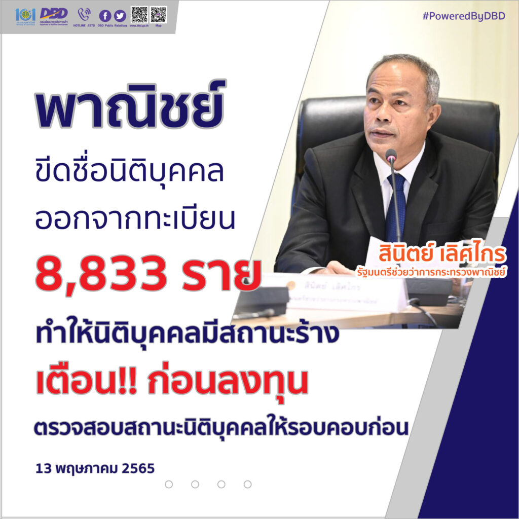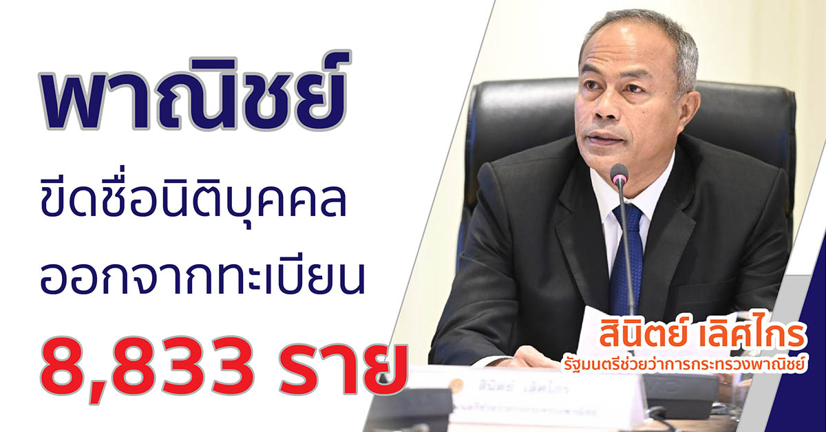 นายสินิตย์ เลิศไกร รัฐมนตรีช่วยว่าการกระทรวงพาณิชย์ เปิดเผยว่า นายทศพล ทังสุบุตร อธิบดีกรมพัฒนาธุรกิจการค้า รายงานให้ทราบว่า ปีงบประมาณ 2564 กรมพัฒนาธุรกิจการค้าได้ดำเนินการขีดชื่อนิติบุคคลที่มีสำนักงานแห่งใหญ่ตั้งอยู่ในเขตกรุงเทพมหานครออกจากทะเบียน เนื่องจาก “ไม่นำส่งงบการเงิน” ติดต่อกัน 3 ปี (ปีงบการเงิน 2560-2562) จำนวน 4,441 ราย และไม่จดทะเบียนเสร็จการชำระบัญชีภายใน 3 ปีนับแต่วันรับจดทะเบียนเลิก จำนวน 4,392 ราย รวมทั้งสิ้น 8,833 ราย เพื่อปรับปรุงฐานข้อมูลนิติบุคคลให้เป็นปัจจุบัน สร้างความน่าเชื่อถือ ความมั่นใจให้แก่ภาคธุรกิจที่จะนำข้อมูลไปใช้ประโยชน์ในทางธุรกิจ และป้องกันความเสียหายจากกลุ่มมิจฉาชีพต่างๆ