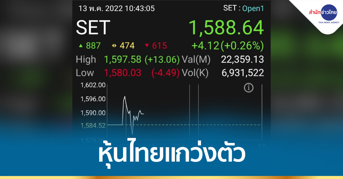 ตลาดหุ้นไทยต้นภาคเช้าปรับตัวขึ้นกว่า 10 จุด แกว่งตัว และเมื่อเวลา 10.43 น. ดัชนี SET มาอยู่ที่ 1,588.64 จุด เพิ่มขึ้นประมาณ 4 จุด
