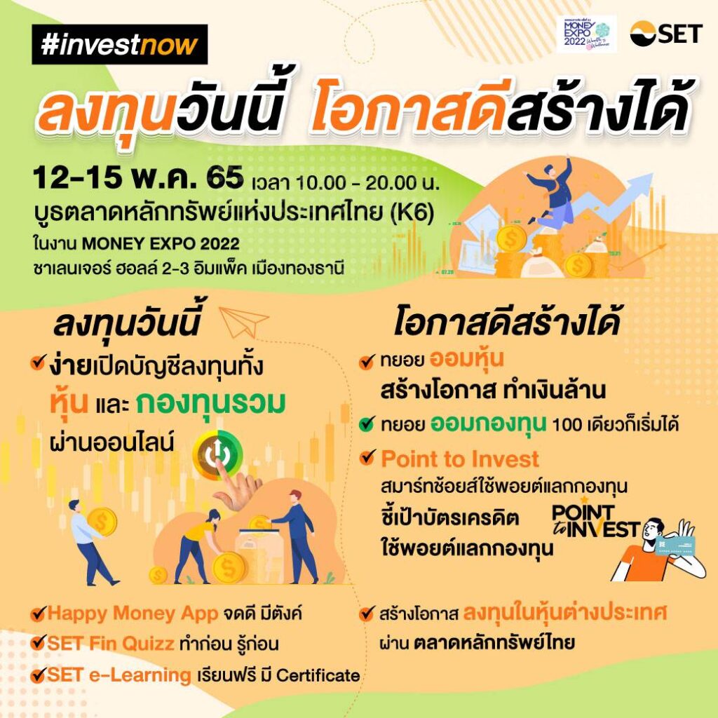 ตลาดหลักทรัพย์ฯแจ้งว่าได้เข้าร่วมงานมหกรรมการเงิน Money Expo 2022 โดยปีนี้มาในแนวคิด “#investnow ลงทุนวันนี้ โอกาสดีสร้างได้” ลงทุนวันนี้ได้ง่าย สะดวก รวดเร็ว โดยผู้ลงทุนสามารถเปิดบัญชีลงทุนทั้งหุ้นและกองทุนรวมผ่านออนไลน์ พร้อมทดลองใช้หลากหลายเครื่องมือเพิ่มพูนความรู้การเงินการลงทุน ไม่ว่าจะเป็นแอปพลิเคชันบริหารจัดการเงิน Happy Money App จดดีมีตังค์ แบบทดสอบความรู้ด้านการเงิน SET Fin Quizz ทำก่อนรู้ก่อน และ SET e-Learning เรียนฟรีมี Certificate
