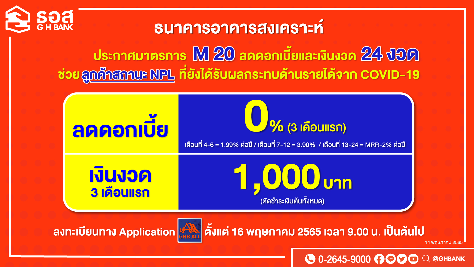 ธนาคารอาคารสงเคราะห์ ช่วยเหลือลูกหนี้สถานะ NPL ที่ยังได้รับผลกระทบด้านรายได้จากปัญหา COVID-19 ให้ใช้อัตราดอกเบี้ยพิเศษและเงินงวดผ่อนชำระต่ำเป็นระยะเวลา 24 งวด ผ่อนเริ่มต้นเดือนที่ 1-3 เพียง 1,000 บาท ดอกเบี้ย 0% ต่อปี (ตัดชำระเงินต้นทั้งหมด) ลงทะเบียนแจ้งความประสงค์ เข้ามาตรการผ่าน Application : GHB ALL ตั้งแต่วันที่ 16 พฤษภาคม 2565 เป็นต้นไป