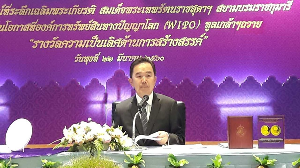 นายจักรกฤศฏิ์ พาราพันธกุล อธิบดีกรมธนารักษ์ กล่าวว่า กรมธนารักษ์ได้จัดทำเหรียญกษาปณ์ที่ระลึกเฉลิมพระเกียรติสมเด็จพระเทพรัตนราชสุดาฯ สยามบรมราชกุมารี เนื่องในโอกาสองค์การทรัพย์สินทางปัญญาโลก (WIPO) ทูลเกล้าฯ ถวาย “รางวัลความเป็นเลิศด้านการสร้างสรรค์” เมื่อวันที่ 27 สิงหาคม 2558 โดยจัดทำเหรียญกษาปณ์ที่ระลึกเฉลิมพระเกียรติ 3 ชนิดราคา ประกอบด้วย เหรียญกษาปณ์ที่ระลึกทองคำขัดเงา ชนิดราคา 16,000 บาท จำหน่ายราคาเหรียญละ 30,000 บาท ผลิตไม่เกิน 5,000เหรียญ เหรียญกษาปณ์ที่ระลึกเงินขัดเงา ชนิดราคา 800 บาท จำหน่ายราคาเหรียญละ 1,600 บาท ผลิตไม่เกิน 30,000 เหรียญ และเหรียญกษาปณ์ที่ระลึกโลหะสีขาว (ทองแดงผสมนิกเกิล) ชนิดราคา 20 บาท จ่ายแลกราคาเหรียญละ 20 บาท ผลิตไม่เกิน 1 ล้านเหรียญ