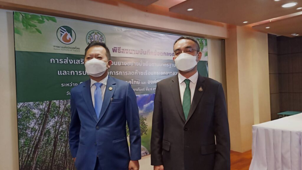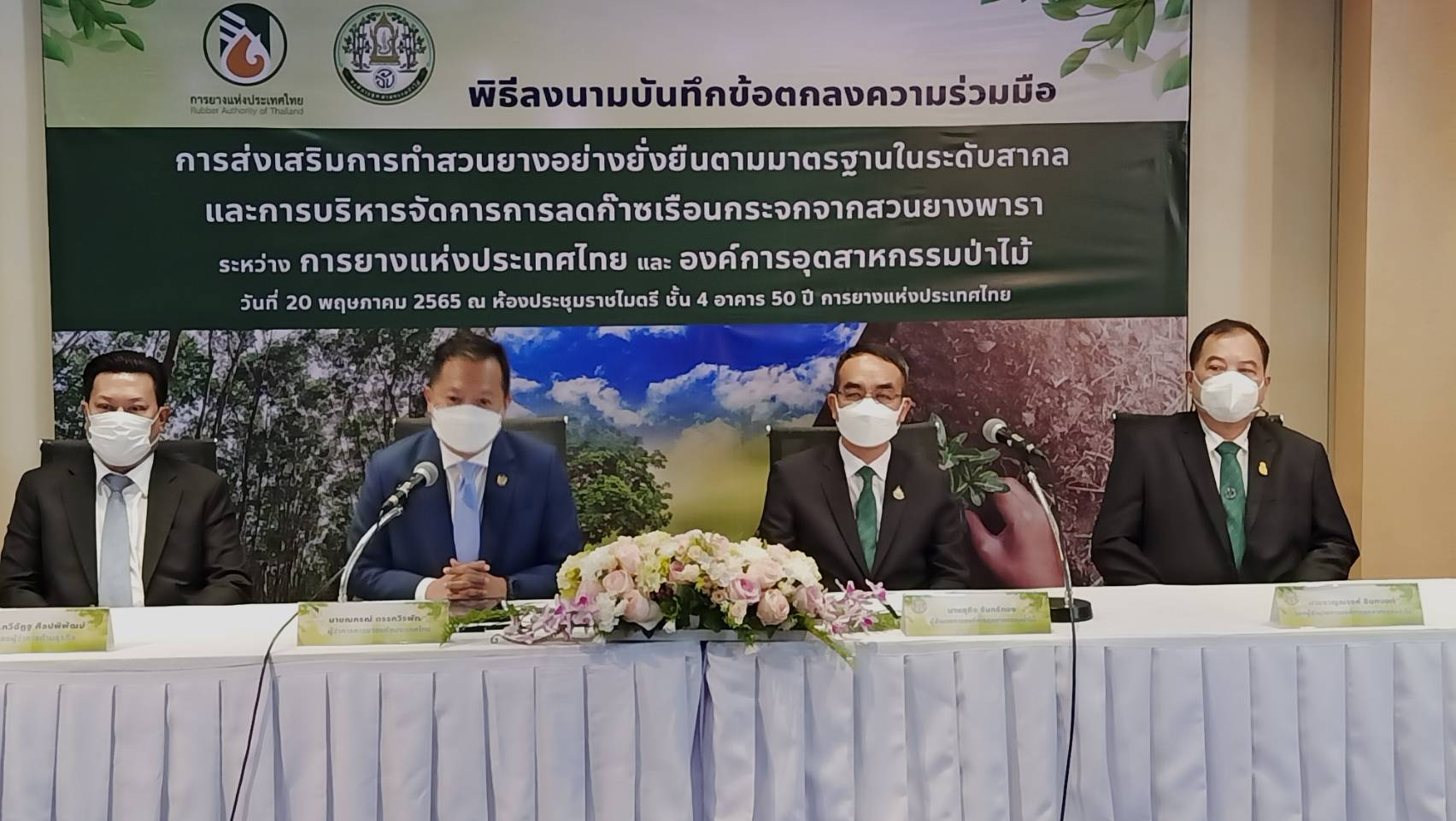 นายณกรณ์ ตรรกวิรพัท ผู้ว่าการการยางแห่งประเทศไทย (กยท.) และนายสุกิจ จันทร์ทอง ผู้อำนวยการองค์การอุตสาหกรรมป่าไม้ (อ.อ.ป.) ร่วมลงนามในบันทึกข้อตกลงความร่วมมือ (MOU) การส่งเสริมการทำสวนยางอย่างยั่งยืนตามมาตรฐานในระดับสากลและการบริหารจัดการการลดก๊าซเรือนกระจกจากสวนยางพารา