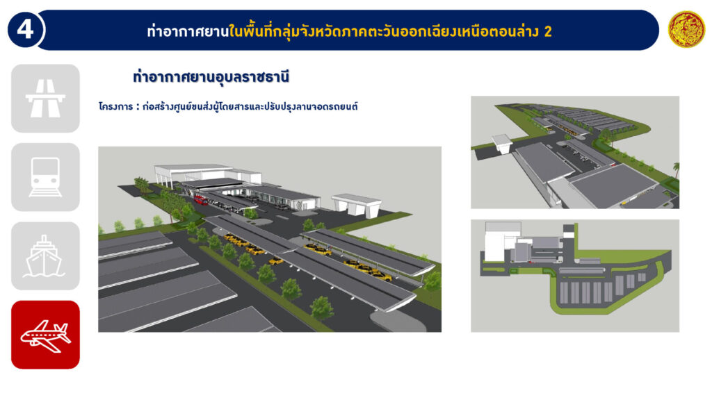 มิติทางน้ำ มีการพัฒนาทางน้ำในพื้นที่กลุ่มจังหวัดภาคตะวันออกเฉียงเหนือตอนล่าง 2 ในพื้นที่จังหวัดอุบลราชธานีและยโสธร ซึ่งปัจจุบันกระทรวงฯ มีโครงการที่อยู่ระหว่างดำเนินการ ดังนี้ 1) โครงการก่อสร้างท่าเทียบเรือในแม่น้ำโขงบริเวณเทศบาลตำบลบ้านด่านโขงเจียม วงเงินลงทุน 36.8 ล้านบาท มีความคืบหน้าโครงการแล้ว ร้อยละ 58.00 2) โครงการจ้างก่อสร้างขุดลอกและบำรุงรักษาร่องน้ำภายในประเทศที่แม่น้ำชี กม. ที่ 55+000 – 60+000 วงเงิน 7.0357 ล้านบาท ขณะนี้อยู่ระหว่างการจัดซื้อจัดจ้าง 3) โครงการซ่อมแซมเขื่อนป้องกันตลิ่งพัง แม่น้ำลำโดมใหญ่ บริเวณท่าน้ำวัดแสงเกษม วงเงินลงทุน 107,000 บาท มีความคืบหน้าโครงการแล้ว ร้อยละ 98.70 และ 4) โครงการซ่อมแซมเขื่อนป้องกันตลิ่งพัง แม่น้ำลำเซบาย อำเภอป่าติ้ว จังหวัดยโสธร วงเงินลงทุน 340,000 บาท มีความคืบหน้าโครงการแล้วร้อยละ 98.70 นอกจากนี้ กระทรวงฯ อยู่ระหว่างดำเนินการโครงการจ้างก่อสร้างขุดลอกและบำรุงรักษาร่องน้ำภายในประเทศที่แม่น้ำชี กม. ที่ 195 – 200 อำเภอพนมไพร จังหวัดร้อยเอ็ด ถึง อำเภอเมืองยโสธร จังหวัดยโสธร วงเงินลงทุน 41.8000 ล้านบาท โดยช่วงกม. ที่ 155+000 – 165+000 อำเภอพนมไพร จังหวัดร้อยเอ็ด ถึงอำเภอคำเขื่อนแก้ว จังหวัดยโสธร วงเงินลงทุน 45.5649 ล้านบาท ดำเนินการแล้วเสร็จ ขณะนี้กำลังอยู่ระหว่างเตรียมการชี้แจงคณะกรรมาธิการ งบประมาณ ปี 2566 ในช่วง กม. ที่ 120+000 และ กม. ที่ 135+000 – 145+000 อำเภอมหาชนะชัย จังหวัดยโสธร