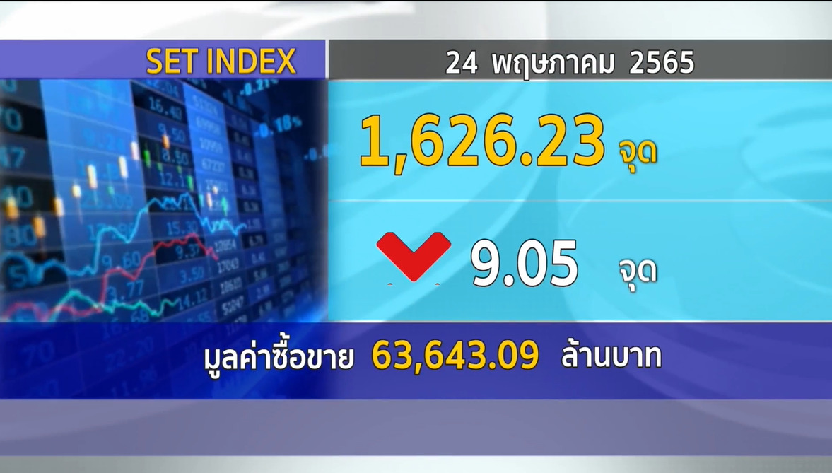 กทม. 24 พ.ค.-ตลาดหลักทรัพย์ ปิดวันนี้ที่ระดับ 1,626.23 จุด ลดลง 9.05 จุด (-0.55%) มูลค่าการซื้อขายราว 63,643.09 ล้านบาท ตลาดหุ้นไทยแกว่งตัวในกรอบ มีแรงเทขายในช่วงท้าย สอดคล้องตลาดภูมิภาคเอเชีย