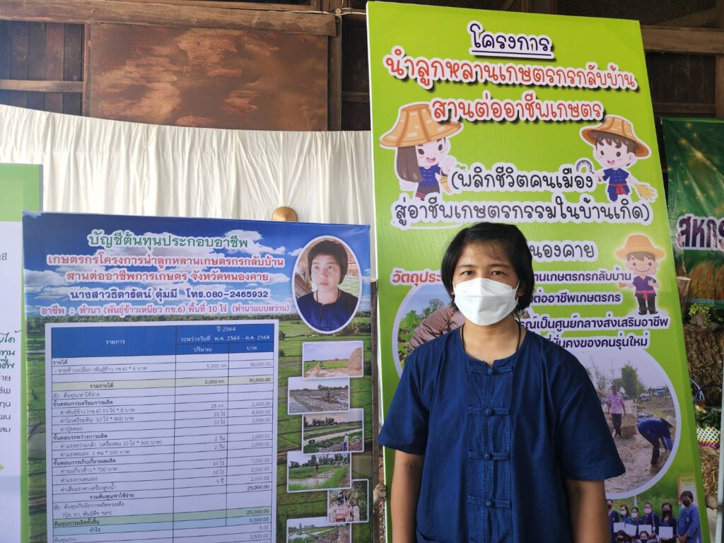 ทั้งนี้ นางสาวธิดารัตน์ ตุ้มมี จบการศึกษาระดับปริญญาตรี มหาวิทยาลัยมหาสารคาม เคยทำงานเป็นเจ้าหน้าที่บัณฑิตวิทยาลัย มหาวิทยาลัยราชภัฏอุดรธานี และลาออกจากสถานที่ทำงาน เนื่องจากสนใจทำอาชีพทางการเกษตร ประกอบกับ ต้องการมาพัฒนาถิ่นบ้านเกิดที่ฟาร์มเกษตรนาปู่ฮักย่า บ้านเลขที่ 60 หมู่ 4 บ้านฝาง ต.น้ำโมง อ.ท่าบ่อ จ.หนองคาย บนเนื้อที่ 15 ไร่ โดยทำการเกษตรแบบผสมผสาน เช่น ขุดบ่อเลี้ยงปลา เลี้ยงปลาในกระชัง เลี้ยงเป็ด ไก่ ปลูกพืชต่าง ๆ ทำให้มีรายได้เพิ่มขึ้น เฉลี่ยเดือนละ 15,000 บาท สามารถสร้างรายได้และสร้างอาชีพการเกษตรอย่างยั่งยืน