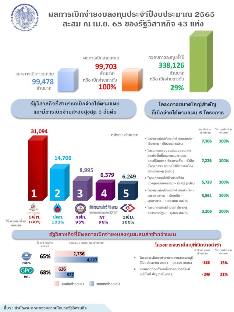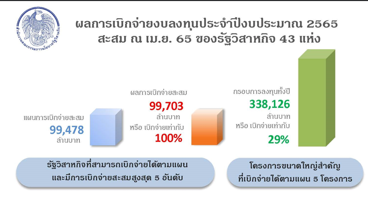 นางปานทิพย์ ศรีพิมล ผู้อำนวยการสำนักงานคณะกรรมการนโยบายรัฐวิสาหกิจ (สคร.) เปิดเผยว่า รัฐวิสาหกิจ 43 แห่ง มีการเบิกจ่ายงบลงทุน สำหรับปี 2565 ณ สิ้นเดือนเมษายน 2565 เบิกจ่าย 99,703 ล้านบาท หรือคิดเป็นร้อยละ 100 ของแผนการเบิกจ่ายสะสม ประกอบด้วย การเบิกจ่ายงบลงทุนของรัฐวิสาหกิจ ใช้บัญชีในระบบปีงบประมาณ (ตุลาคม 2564 – เมษายน 2565) 34 แห่ง จำนวน 56,981 ล้านบาท หรือคิดเป็นร้อยละ 99 ของแผนเบิกจ่ายสะสม ส่วนรัฐวิสาหกิจระบบบัญชีตามปีปฏิทิน (เดือนมกราคม 2565 – เมษายน 2565) 9 แห่ง จำนวน 42,722 ล้านบาท หรือคิดเป็นร้อยละ 102 ของแผนเบิกจ่ายสะสม