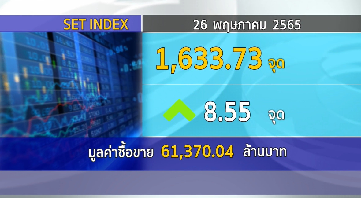 กทม. 26 พ.ค.-ตลาดหลักทรัพย์ ปิดวันนี้ที่ระดับ 1,633.73 จุด เพิ่มขึ้น 8.55 จุด (+0.53%) มูลค่าการซื้อขาย 61,370.04 ล้านบาท ตลาดหุ้นไทยวันนี้แกว่งตัวในแดนบวกทิศทางเดียวกับตลาดหุ้นอื่นในภูมิภาค