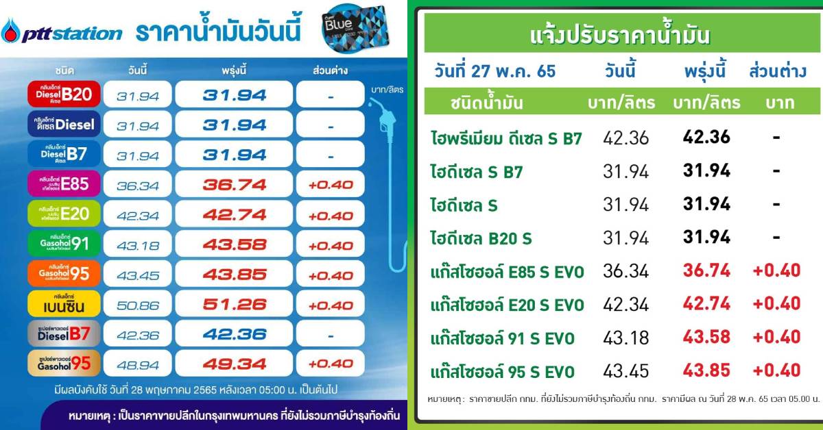 โดยราคาขายปลีกจะเป็นดังนี้ ULG = 51.26, GSH95 = 43.85, E20 = 42.74, GSH91 = 43.58, E85 = 36.74, HSD- B7= 31.94, HSD-B10 = 31.94, HSD-B20=31.94, ดีเซลพรีเมี่ยม B7 = 42.36 บาทต่อลิตร โดยราคาขายปลีกข้างต้นยังไม่รวมภาษีบำรุงกรุงเทพมหานคร.-สำนักข่าวไทย
