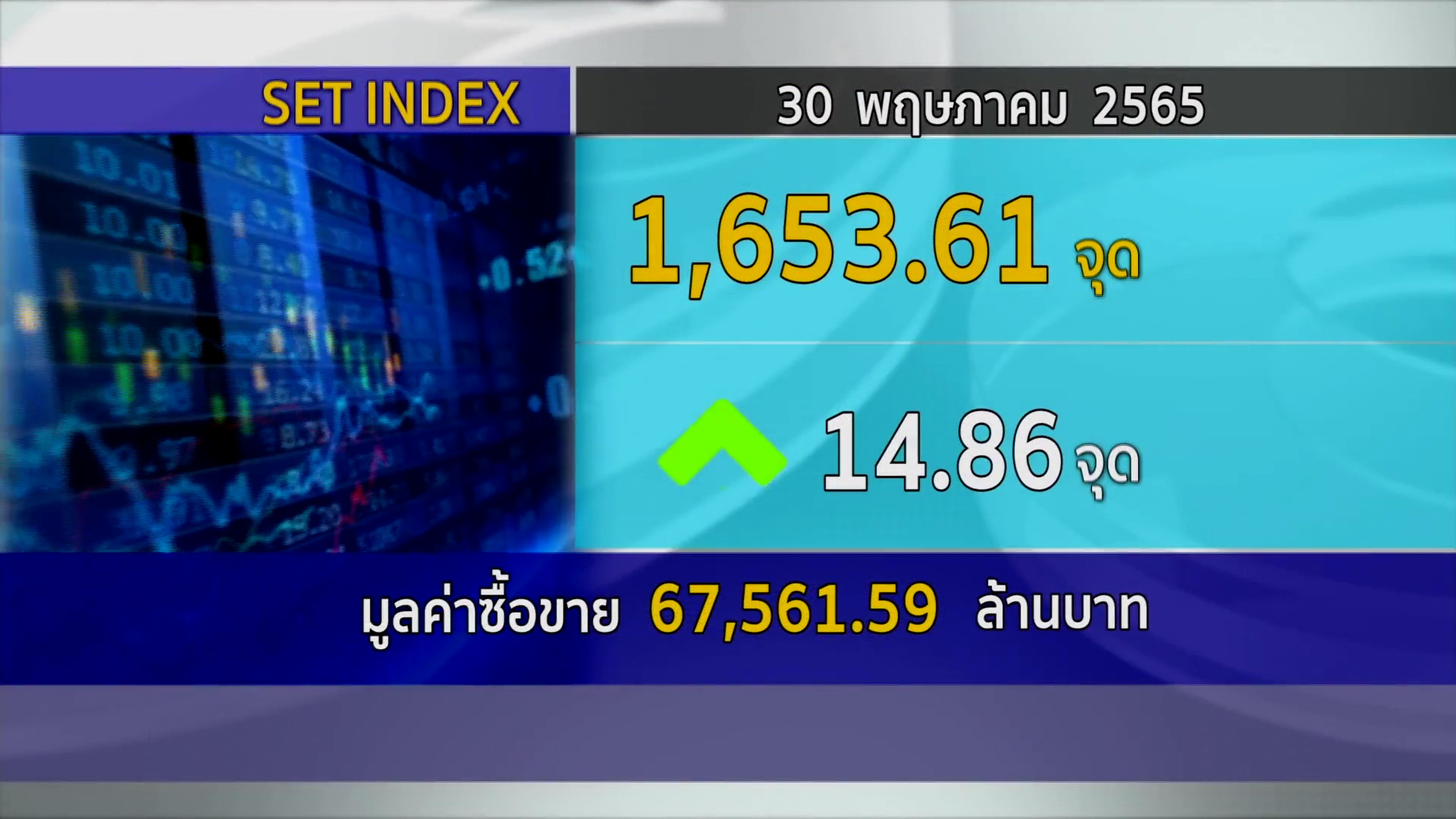 กทม. 30 พ.ค.- ตลาดหลักทรัพย์ ปิดวันนี้ที่ระดับ 1,653.61 จุด เพิ่มขึ้น 14.86 จุด (+0.91%) มูลค่าการซื้อขาย 67,561.59 ล้านบาท แรงซื้อกลุ่มเปิดเมืองหนุน