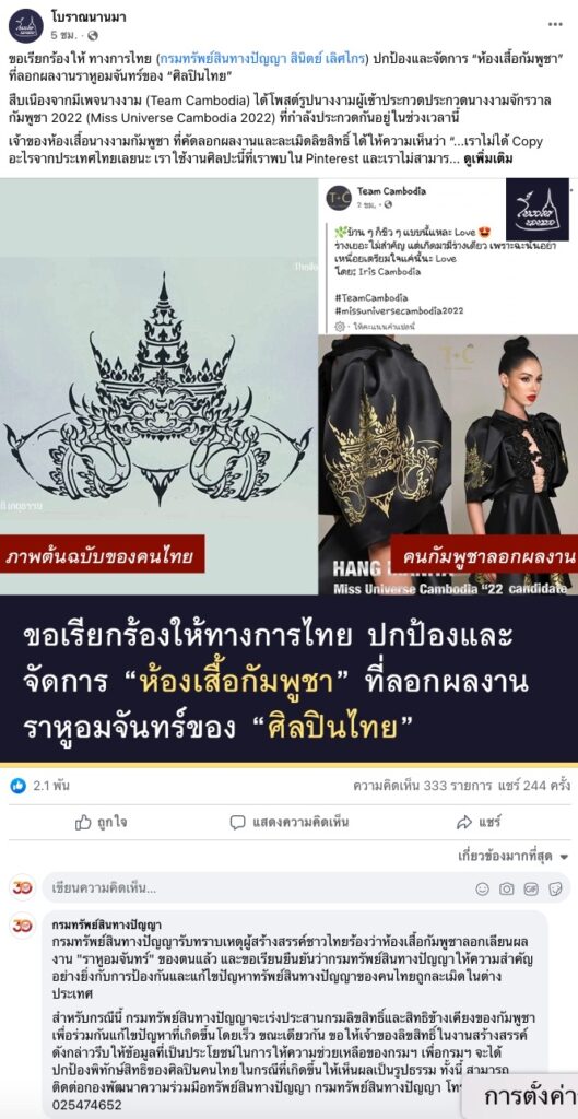 นนทบุรี 1 มิ.ย.-กรมทรัพย์สินทางปัญญาพร้อมปกป้องงานลิขสิทธิ์ “ราหูอมจันทร์” ของศิลปินไทยยุติปัญหาการละเมิดลิขสิทธิ์ในกัมพูชาจากกรณีห้องเสื้อในกัมพูชานำผลงานการออกแบบลายไทย “ราหูอมจันทร์” ของคุณฐิติ เกตุธรรมศิลปินคนไทย ไปใช้บนชุดผู้เข้าประกวด Miss Universe 2022 ของกัมพูชาที่ไม่ได้รับอนุญาต ย้ำกรมทรัพย์สินทางปัญญาเข้าช่วยเหลือและรวบรวมหลักฐานและติดต่อกรมลิขสิทธิ์ฯ กระทรวงวัฒนธรรมและศิลปกรรม ประเทศกัมพูชาแล้ว