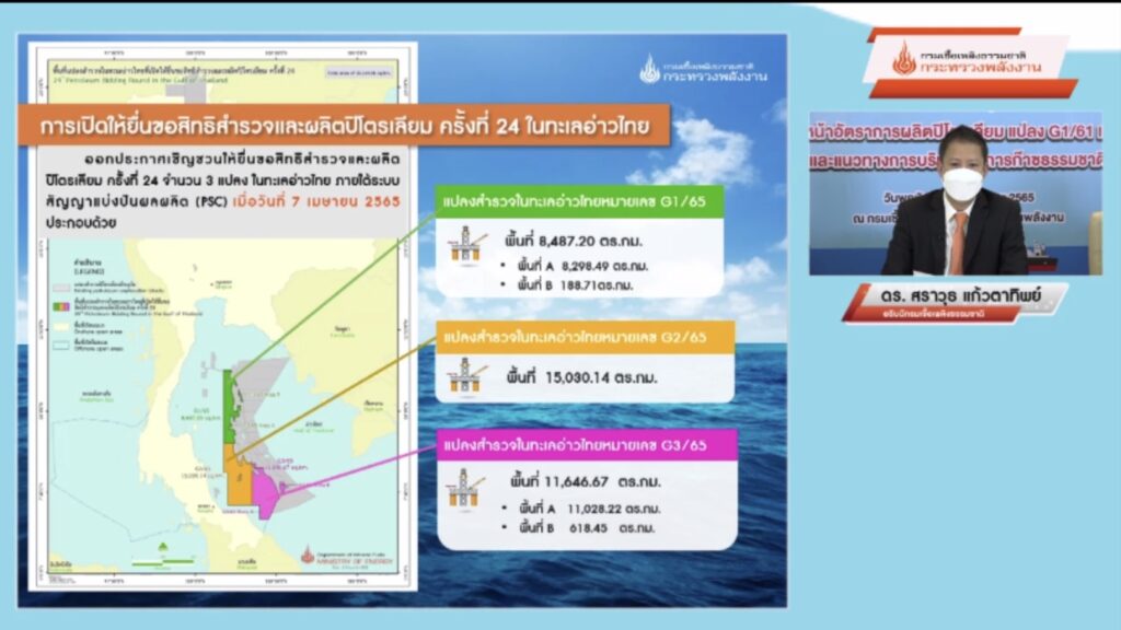 ในส่วนของการจัดหาก๊าซธรรมชาติในระยะยาว กรมฯ ได้เปิดให้ยื่นขอสิทธิสำรวจและผลิตปิโตรเลียมรอบที่ 24 ภายใต้ระบบสัญญาแบ่งปันผลผลิต บริเวณทะเลอ่าวไทยจำนวน 3 แปลง ประกอบด้วย ได้แก่ G1/65 พื้นที่ 8,487.20 ตารางกิโลเมตร, G2/65พื้นที่ 15,030.14 ตารางกิโลเมตร และ G3/65 พื้นที่ 11,646.67 ตารางกิโลเมตร ซึ่งในขณะนี้ มีผู้สนใจแล้ว 4 ราย ทั้งในและต่างประเทศ โดยต้องยื่นคำขอสิทธิภายในเดือนกันยายนนี้ และประกาศผลผู้ชนะในเดือนกุมภาพันธ์ 2566 ซึ่งจากการที่ราคาปิโตรเลียมราคาสูงและแหล่งผลิตมีศักยภาพจึงคาดว่า จะก่อให้เกิดเม็ดเงินลงทุนมากกว่า 1,500 ล้านบาท จากกิจกรรมการสำรวจปิโตรเลียม และหากมีการค้นพบปิโตรเลียมที่มีสมรรถนะเชิงพาณิชย์ ก็จะเกิดเม็ดเงินลงทุนในการพัฒนาอีกนับหมื่นล้านบาท