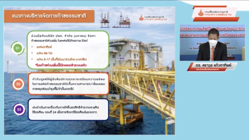 นายสราวุธ แก้วตาทิพย์ อธิบดีกรมเชื้อเพลิงธรรมชาติ เปิดเผยว่า หลังการเปลี่ยนผ่านการดำเนินงานของแปลง G1/61 (แหล่งก๊าซธรรมชาติเอราวัณ) และ แปลง G2/61 (แหล่งก๊าซธรรมชาติบงกช) จากระบบสัมปทานเป็นระบบสัญญาแบ่งปันผลผลิต เมื่อวันที่ 23 เมษายน 2565 ที่ผ่านมา นั้น ความคืบหน้าเกี่ยวกับอัตราการผลิตปิโตรเลียมเฉลี่ยเดือนพฤษภาคมของแปลง G1/61 อยู่ที่ประมาณ 300 ล้านลูกบาศก์ฟุตต่อวัน (ต่ำกว่าแผนเงินเดิมที่ จะต้องผลิตได้ราว 800 ล้านลูกบาศก์ฟุตต่อวัน) และแปลง G2/61 อยู่ที่ประมาณ 870 ล้าน ลูกบาศก์ฟุตต่อวัน โดยกรมฯผลักดันให้บริษัท ปตท.สผ. เอนเนอร์ยี่ ดีเวลลอปเมนท์ จำกัด (ปตท.สผ. อีดี) ในฐานะผู้รับสัญญาแบ่งปันผลผลิต เร่งการลงทุนเพื่อเพิ่มกำลังการผลิตปิโตรเลียม (Ramp up) ของแปลง G1/61 ให้เป็นไปตามเป้าหมายโดยเร็ว เพื่อรักษาความมั่นคงด้านการจัดหาพลังงานของประเทศ โดยขณะนี้ปตท.ได้ขุดหลุมสำรวจ 70-100 หลุม และคาดว่ากำลังผลิตจะเพิ่มได้เป็น 400 ล้านลูกบาศก์ฟุตต่อวัน ในปลายปีนี้