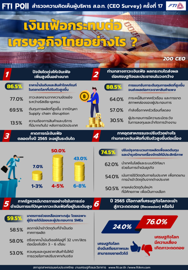 นายมนตรี มหาพฤกษ์พงศ์ รองประธานสภาอุตสาหกรรมแห่งประเทศไทย (ส.อ.ท.) เปิดเผยผลสำรวจ FTI Poll เดือนพฤษภาคม 2565 ภายใต้หัวข้อ “เงินเฟ้อกระทบต่อเศรษฐกิจไทยอย่างไร” พบว่า ผู้บริหาร ส.อ.ท. มองว่า ราคาน้ำมันดิบและสินค้าโภคภัณฑ์ในตลาดโลกที่ปรับตัวสูงขึ้น จากผลกระทบของวิกฤติความขัดแย้งระหว่างรัสเซีย-ยูเครน และปัญหา Supply chain disruption เป็นปัจจัยหลักที่เร่งให้ภาวะเงินเฟ้อปรับตัวเพิ่มสูงขึ้น จนส่งผลให้ผู้ประกอบการต้องแบกรับภาระต้นทุนการผลิตที่สูงขึ้น ทั้งจากราคาวัตถุดิบและพลังงาน รวมทั้งยังกดดันกำลังซื้อภาคครัวเรือนให้ลดลงอีกด้วย โดยผู้บริหาร ส.อ.ท. คาดว่า ตลอดทั้งปี 2565 อัตราเงินเฟ้อของไทยจะอยู่ที่ระดับ 4-5% จึงเสนอขอให้ภาครัฐเร่งพิจารณาออกมาตรการช่วยเหลือเฉพาะกลุ่ม โดยเฉพาะผู้มีรายได้น้อยและผู้ประกอบการ SMEs รวมทั้งปรับลดภาษีนำเข้าวัตถุดิบที่จำเป็นต่อภาคการผลิต เช่น วัตถุดิบอาหารสัตว์ ปุ๋ย เป็นต้น และตรึงราคาน้ำมันดีเซลให้อยู่ที่ 32 บาท/ลิตร ต่อเนื่องไปอีก 3-6 เดือน เพื่อบรรเทาผลกระทบของผู้ประกอบการและประชาชน นอกจากนี้ หากสถานการณ์ความขัดแย้งระหว่างรัสเซีย-ยูเครน ทวีความรุนแรงมากขึ้น และเพิ่มความเข้มข้นของมาตรการคว่ำบาตรต่อรัสเซียจากยุโรปและสหรัฐ อาจส่งผลกระทบต่ออัตราเงินเฟ้อให้ปรับตัวสูงขึ้นอีก จนทำให้เศรษฐกิจโลกมีความเสี่ยงที่จะเข้าสู่ภาวะถดถอย หรือ Recession ได้