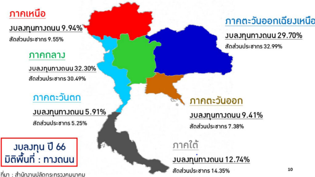 - การกระจายตัวของงบประมาณ ของกระทรวงคมนาคมประจำปี 2566 พบว่างบประมาณภาพรวมในทุกมิติของรูปแบบการคมนาคมขนส่งทั้งถนน ราง น้ำ อากาศ ได้รับจัดสรรลงในพื้นที่ มีการกระจายตัวครอบคลุมทุกภูมิภาคของประเทศ เช่น ด้านการขนส่งทางถนน การกระจายตัวของงบประมาณสอดคล้องกับการกระจายตัวของประชากรในแต่ละภูมิภาค โดยภาคกลางมีการจัดสรรงบประมาณสูงสุด ประมาณ ร้อยละ 32.3 เนื่องจาก ภาคกลางมีประชากรอยู่ประมาณ ร้อยละ 30 ของทั้งประเทศ ส่วนภาคเหนือมีการจัดสรรงบประมาณเพียง ร้อยละ 9.94 ของทั้งประเทศ เพราะมีประชากร ร้อยละ 9.55 ของประเทศ เป็นต้น แสดงให้เห็นว่าการจัดสรรงบประมาณของกระทรวงคมนาคมสอดคล้องกับความจำเป็นที่ต้องใช้ และความต้องการของประชาชนในแต่ละพื้นที่อย่างแท้จริง