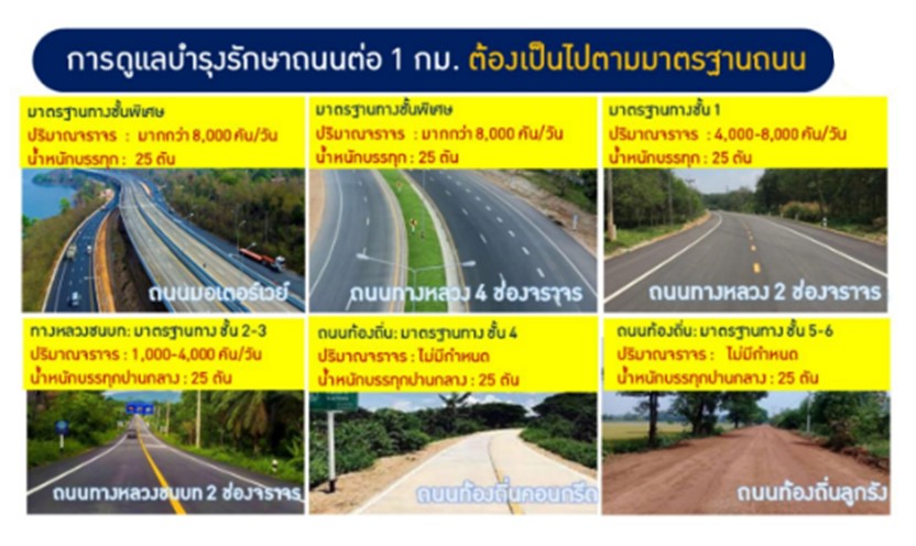- การบริหารจัดการถนนระหว่างส่วนกลางกับท้องถิ่น โครงข่ายถนนในประเทศไทยกว่า 700,000 กว่ากิโลเมตร อยู่ในความรับผิดชอบของกระทรวงคมนาคม ประมาณ 100,000 กิโลเมตร โดยมีหน่วยงานรับผิดชอบ คือ กรมทางหลวง กรมทางหลวงชนบท และการทางพิเศษแห่งประเทศไทย และอีกกว่า 600,000 กิโลเมตรนั้น อยู่ในความรับผิดชอบของกระทรวงมหาดไทย โดยกรุงเทพมหานคร และองค์กรปกครองส่วนท้องถิ่น ในส่วนของกระทรวงคมนาคมได้พิจารณาจัดสรรงบประมาณตามมาตรฐานของถนนแต่ละประเภท โดยขึ้นอยู่กับปริมาณจราจร และการรับน้ำหนักบรรทุก ซึ่งถนนมาตรฐานสูง เช่น มอเตอร์เวย์ ทางหลวง 4 ช่องจราจร ก็จะใช้งบประมาณในการซ่อมบำรุงที่สูงกว่า เมื่อเทียบกับถนนท้องถิ่นที่เป็นถนนลูกรังที่ใช้งบประมาณที่น้อยกว่า จึงจะเห็นได้ว่ามาตรฐานชั้นทางที่ต่างกัน การรับปริมาณจราจร และปริมาณรถบรรทุกก็ต่างกัน ทำให้งบประมาณในการซ่อมบำรุงต่อกิโลเมตร จึงแตกต่างกัน