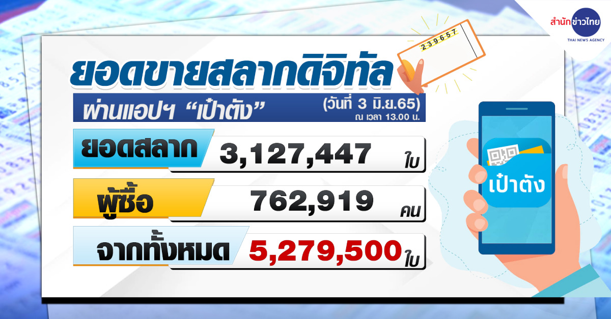 อสมท 3 มิ.ย. – ยอดจำหน่ายสลากดิจิทัลผ่านแอปฯ “เป๋าตัง” วันที่ 2 ณ เวลา 13.00 น. ทะลุ 3.1 ล้านใบ จากทั้งหมด 5.2 ล้านใบ เฉลี่ยซื้อคนละ 4 ใบ