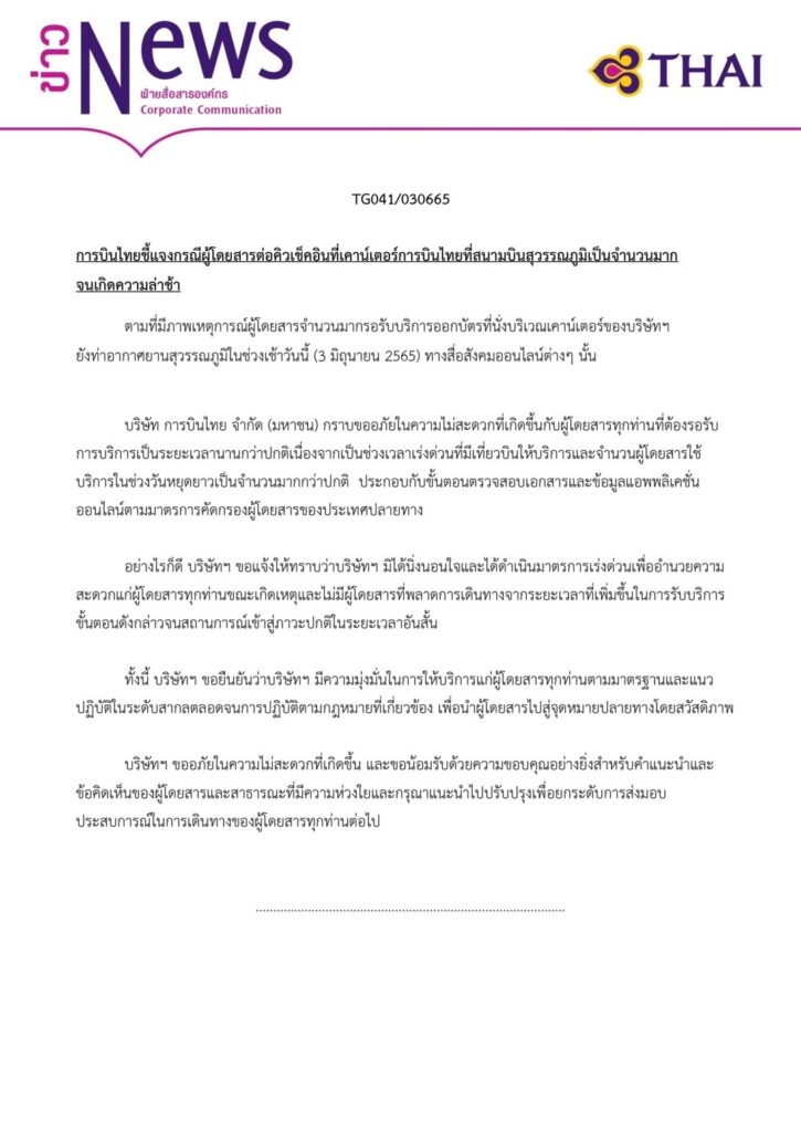 บริษัท การบินไทย จำกัด (มหาชน) ออกแถลงการณ์ตามที่มีภาพเหตุการณ์ผู้โดยสารจำนวนมาก รอรับบริการออกบัตรที่นั่งบริเวณเคาน์เตอร์ของบริษัทฯ ยังท่าอากาศยานสุวรรณภูมิในช่วงเช้าวันที่ 3 มิถุนายน 2565 ทางสื่อสังคมออนไลน์ต่างๆ บริษัทกราบขออภัยในความไม่สะดวกที่เกิดขึ้นกับผู้โดยสารทุกท่านที่ต้องรอรับการบริการเป็นระยะเวลานานกว่าปกติ เนื่องจากเป็นช่วงเวลาเร่งด่วนที่มีเที่ยวบินให้บริการและจำนวนผู้โดยสารใช้บริการในช่วงวันหยุดยาวเป็นจำนวนมากกว่าปกติ ประกอบกับขั้นตอนตรวจสอบเอกสารและข้อมูลแอปพลิเคชันออนไลน์ตามมาตรการคัดกรองผู้โดยสารของประเทศปลายทาง