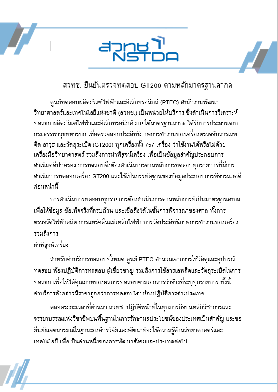 สำนักงานพัฒนาวิทยาศาสตร์และเทคโนโลยีแห่งชาติ (สวทช.) ระบุว่า ศูนย์ทดสอบผลิตภัณฑ์ไฟฟ้าและอิเล็กทรอนิกส์ (PTEC) ของสวทช. ซึ่งเป็นหน่วยให้บริการวิเคราะห์ ทดสอบ ผลิตภัณฑ์ไฟฟ้าและอิเล็กทรอนิกส์ภายใต้มาตรฐานสากล ได้รับการประสานจากกรมสรรพาวุธทหารบกเพื่อตรวจสอบประสิทธิภาพการทำงานของเครื่องตรวจจับสารเสพติด อาวุธ และวัตถุระเบิด (GT200) ทุกเครื่องทั้ง 757 เครื่อง ว่าใช้งานได้หรือไม่ด้วยเครื่องมือวิทยาศาสตร์ รวมถึงการผ่าพิสูจน์เครื่อง เพื่อเป็นข้อมูลสำคัญประกอบการดำเนินคดีปกครอง