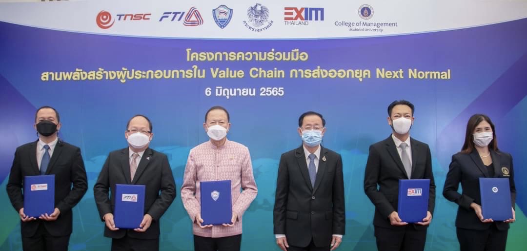 นายเกรียงไกร เธียรนุกุล ประธานสภาอุตสาหกรรมแห่งประเทศไทย (ส.อ.ท.) และ ดร.ชัยชาญ เจริญสุข ประธานสภาผู้ส่งสินค้าทางเรือแห่งประเทศไทย (สรท.) ร่วมลงนามใน MOU ดังกล่าว และโครงการความร่วมมือด้านวิชาการเพื่อพัฒนาศักยภาพผู้ประกอบการด้วยทักษะและสมรรถนะในโลกการค้ายุคใหม่ โดยมี รศ.ดร.วิชิตา รักธรรม คณบดีวิทยาลัยการจัดการ มหาวิทยาลัยมหิดล (CMMU) เข้าร่วมลงนามใน MOU ดังกล่าว ร่วมกับ EXIM BANK สภาหอฯ ส.อ.ท. และ สรท. ณ ห้องวายุภักษ์ 4 กระทรวงการคลัง เมื่อวันที่ 6 มิถุนายน 2565