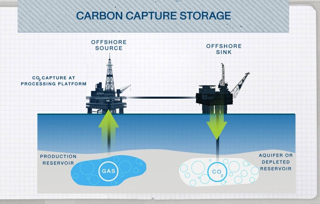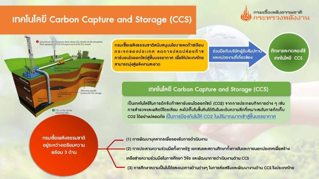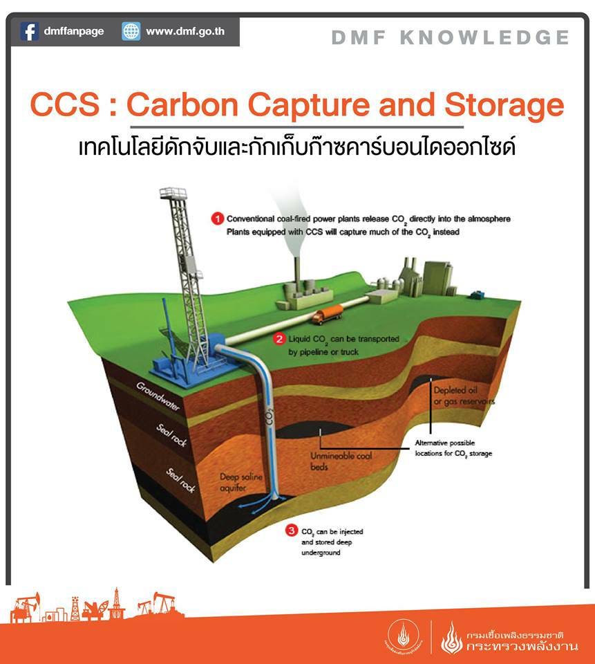 สำหรับ CCS เป็นกระบวนการดักจับก๊าซคาร์บอนไดออกไซด์ (CO2) จากโรงไฟฟ้าหรือโรงงานอุตสาหกรรมที่ใช้เชื้อเพลิงฟอสซิลในกระบวนการผลิต แล้วฉีดอัดก๊าซคาร์บอนร้อยละ 90 ที่ปล่อยจากแหล่งกำเนิดดังกล่าวลงสู่ใต้ดินที่ความลึกหลายกิโลเมตร (Geological formation) ซึ่งการนำคาร์บอนกลับคืนสู่แหล่งกำเนิดจะถูกเก็บไว้ไม่รั่วไหลออกมาเป็นเวลาหลายล้านปี