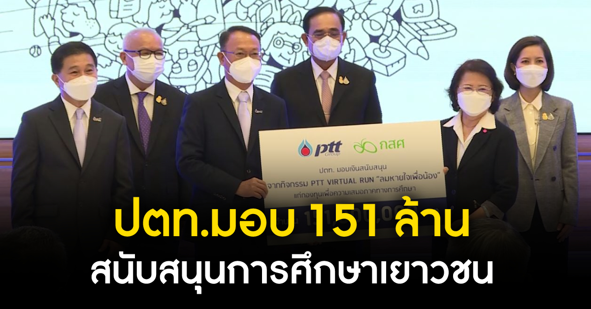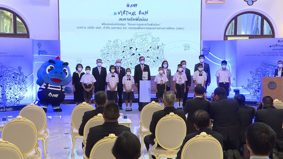 พล.อ.ประยุทธ์ จันทร์โอชา นายกรัฐมนตรี เป็นประธานในพิธีมอบเงินสนับสนุนการศึกษาเยาวชน จากกิจกรรม PTT Virtual Run ภายใต้ “โครงการลมหายใจเพื่อน้อง” ของบริษัท ปตท. จำกัด (มหาชน) โดยศาสตราจารย์พิเศษ ดร.ทศพร ศิริสัมพันธ์ ประธานกรรมการ ปตท. เป็นผู้แทนมอบเงิน 151 ล้านบาท ให้กรรมการบริหารกองทุนเพื่อความเสมอภาคทางการศึกษา (กสศ.) เพื่อคืนโอกาสทางการศึกษาให้แก่เด็กและเยาวชน ที่มีความเสี่ยงหลุดออกจากระบบการศึกษาในปี 2565 ให้สามารถกลับเข้าสู่ระบบได้
