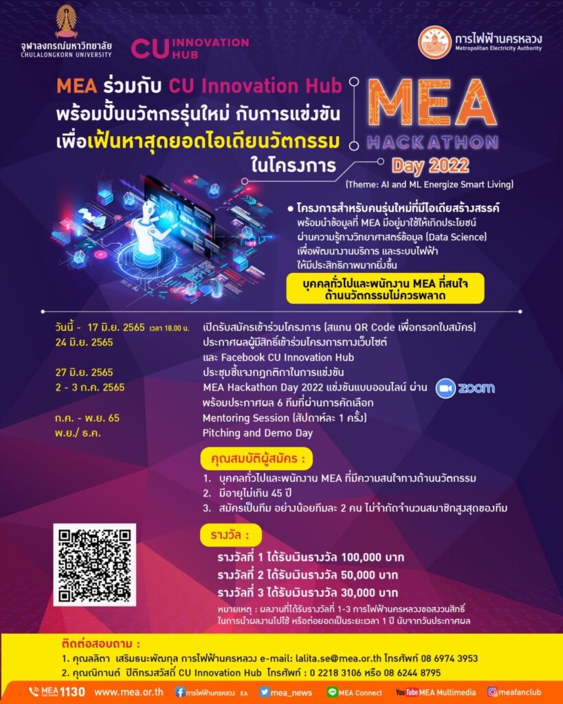 9 มิ.ย.- MEA ร่วมกับ CU Innovation Hub พร้อมปั้นนวัตกรรุ่นใหม่ กับการแข่งขันเพื่อเฟ้นหาสุดยอดไอเดียนวัตกรรมในโครงการ MEA Hackathon Day 2022 (Theme: AI and ML Energize Smart Living)