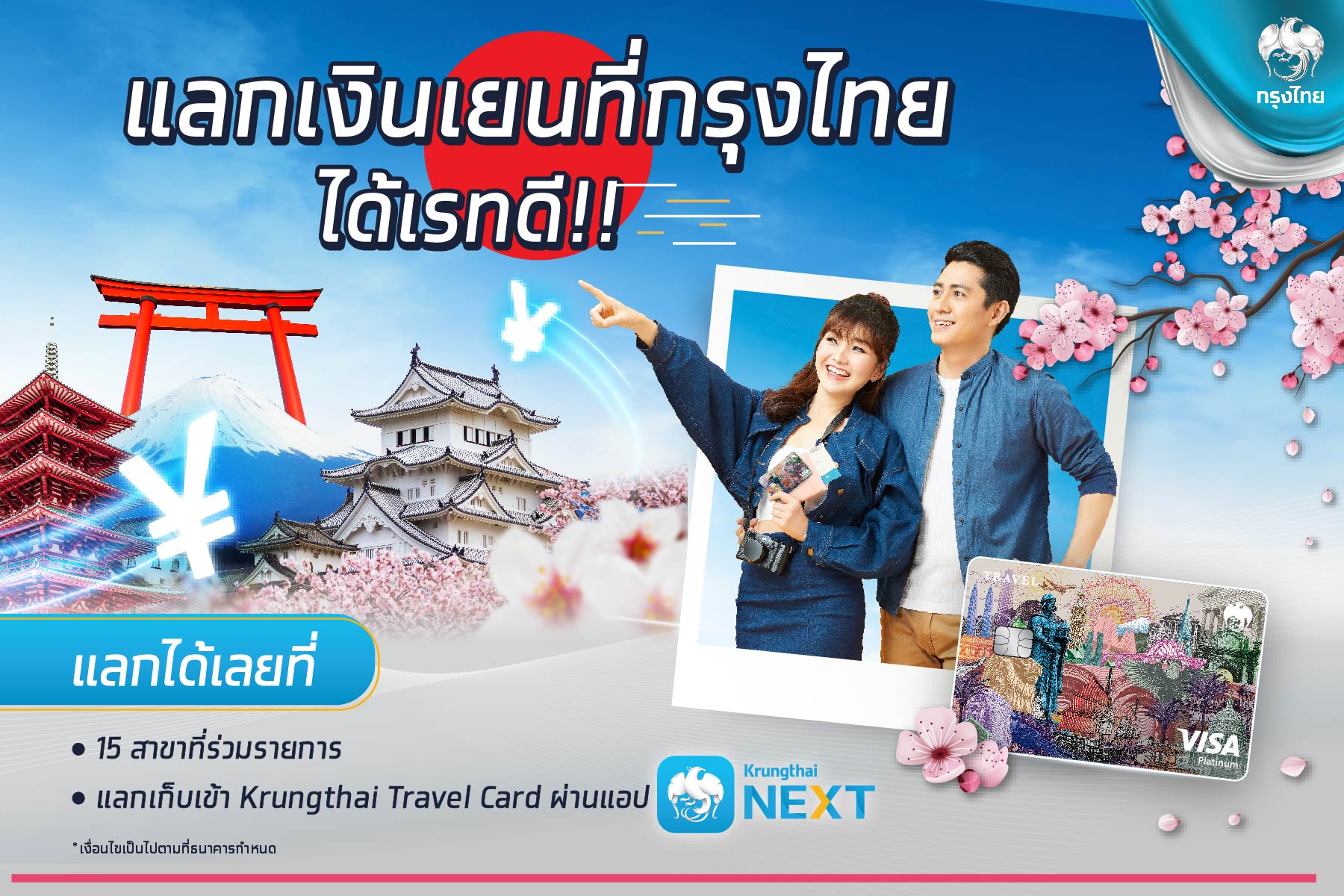 พร้อมเสนอ “Krungthai Travel Card” แลกเงินเยน ผ่านแอปพลิเคชัน Krungthai NEXT สามารถรูดใช้จ่ายผ่านบัตร คุ้มค่าด้วยอัตราแลกเปลี่ยนเงินสกุลต่างประเทศที่ดี รองรับการแลกเปลี่ยนมากถึง 19 สกุลเงิน ตลอด 24 ชม. ได้แก่ AUD, CAD, CHF, DKK, EUR, GBP, HKD, INR, JPY, KRW, MYR , NOK, NZD, RUB, SEK, SGD, TWD, USD และ THB โดยไม่เสียค่าธรรมเนียมความเสี่ยงจากอัตราแลกเปลี่ยน 2.5% ด้วย