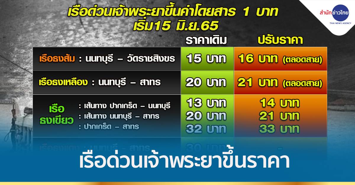 นาวาตรีเจริญพร เจริญธรรม กรรมการผู้จัดการบริษัท เรือด่วนเจ้าพระยา จำกัด ผู้ให้บริการเรือโดยสารในแม่น้ำเจ้าพระยา ในเส้นทางระหว่างท่าเรือปากเกร็ด-ท่าเรือวัดราชสิงขร กล่าวว่า มีความจำเป็นที่ต้องปรับอัตราค่าโดยสาร เรือธงส้ม ธงเหลือง ธงเขียว ขึ้น 1 บาท จากอัตราเดิม ส่วนเรือธงแดง (ปรับอากาศ) นนทบุรี-สาทร ราคา 30 บาทตลอดสาย คงเดิม เนื่องจากสถานการณ์โควิด-19 ตั้งแต่เดือน ก.พ. 2563 จนถึงปัจจุบัน ทำให้ผู้โดยสารลดลงจำนวนมาก ประกอบกับราคาน้ำมันดีเซลที่ปรับตัวสูงขึ้นอย่างต่อเนื่อง จึงมีความจำเป็นที่จะต้องปรับอัตราค่าโดยสาร แต่หากราคาน้ำมันลดลงต่ำกว่าเกณฑ์ บริษัทฯ จะปรับลดอัตราค่าโดยสารต่อไป. – สำนักข่าวไทย