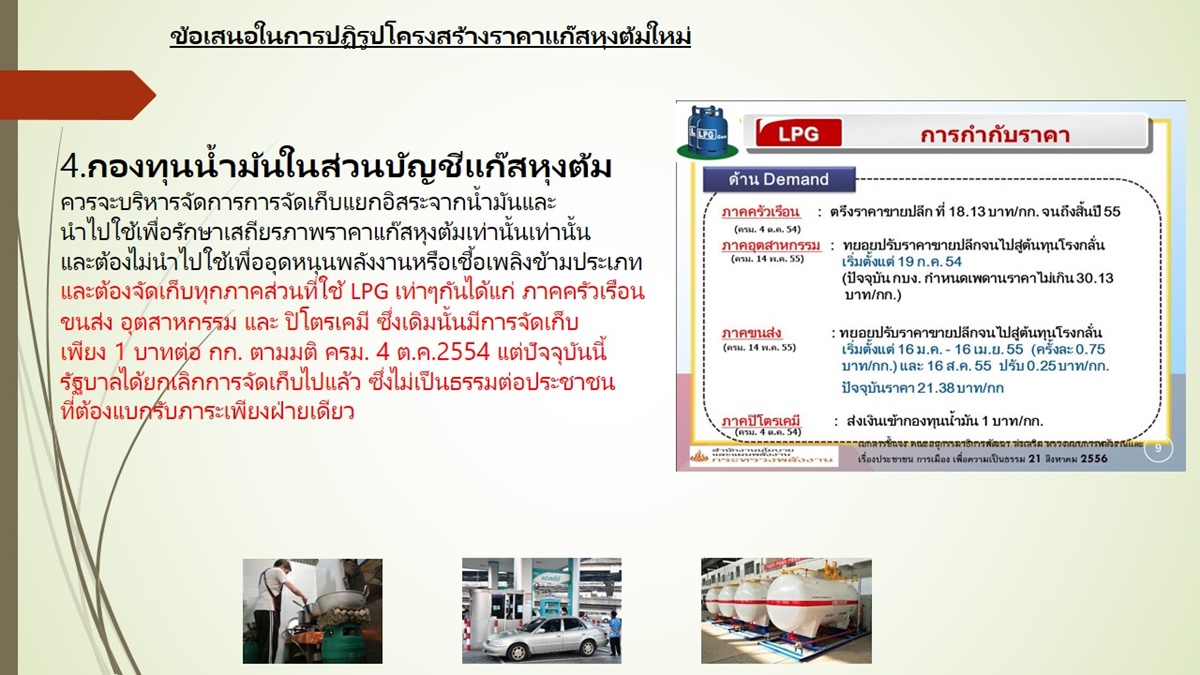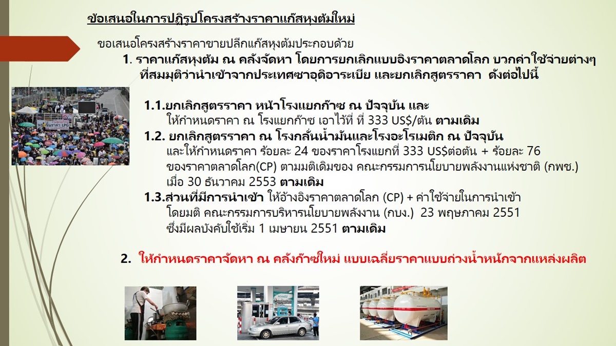 ส่วนเรื่องราคาก๊าซหุงต้ม นายปานเทพ พัวพงษ์พันธ์ คณะทำงานเพื่อราคาพลังงานที่เป็นธรรม (ภาคประชาชน) กล่าวว่า ทางกลุ่มฯ เสนอให้ยกเลิกโครงสร้างราคาในปัจจุบัน และย้อนกลับไปใช้โครงสร้างราคาช่วงการปฏิวัติ ก่อนที่ พล.อ.ประยุทธ์ จันทร์โอชา ดำรงตำแหน่งนายกรัฐมนตรี โดยขอให้ใช้ราคาหน้าโรงแยกก๊าซฯ ที่ 333 ดอลลาร์สหรัฐ/ตัน และให้ยกเลิกสูตรราคา ณ โรงกลั่นน้ำมันและโรงอะโรเมติกส์ ณ ปัจจุบัน และให้กำหนดราคา ร้อยละ 24 ของราคาโรงแยกที่ 333 ดอลลาร์สหรัฐ/ตัน + ร้อยละ 76 ของราคาตลาดโลก (CP) ตามมติเดิมของคณะกรรมการนโยบายพลังงานแห่งชาติ (กพช.) เมื่อวันที่ 30 ธันวาคม 2553 ส่วนที่มีการนำเข้า ให้อ้างอิงราคาตลาดโลก (CP) + ค่าใช้จ่ายในการนำเข้า โดยมติคณะกรรมการบริหารนโยบายพลังงาน (กบง.) 23 พฤษภาคม 2551 ซึ่งมีผลบังคับใช้เริ่ม 1 เมษายน 2551 ตามเดิม พร้อมทั้งควรกำหนดราคาจัดหา ณ คลังก๊าซใหม่ เฉลี่ยราคาแบบถ่วงน้ำหนักจากแหล่งผลิต