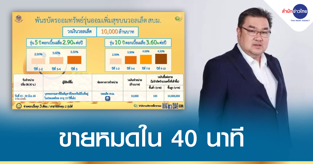 กรุงเทพฯ 13 มิ.ย.-“สบน.-กรุงไทย” ปลื้มผู้ลงทุนแห่จองซื้อพันธบัตรออมทรัพย์รุ่น “ออมเพิ่มสุข” บนวอลเล็ต สบม. ในแอปฯ เป๋าตัง วงเงิน 10,000 ล้านบาท หมดภายใน 40 นาที ทั้ง 2 รุ่น คือ รุ่นอายุ 5 ปีและ 10 ปี ยอดล้นทะลักสูงกว่าคาดการณ์ และมากกว่าครั้งที่ผ่านมาถึง 4.5 เท่า ทำให้สะดุดไป 28 นาที ก่อนเร่งเพิ่มประสิทธิภาพระบบรองรับการซื้อโดยเร็ว ขายหมดภายใน 12 นาที ย้ำเดินหน้าพัฒนาผลิตภัณฑ์และบริการ หนุนประชาชนทุกกลุ่มเข้าถึงการออมผ่านดิจิทัลอย่างทั่วถึง เท่าเทียม โปร่งใส และยั่งยืน