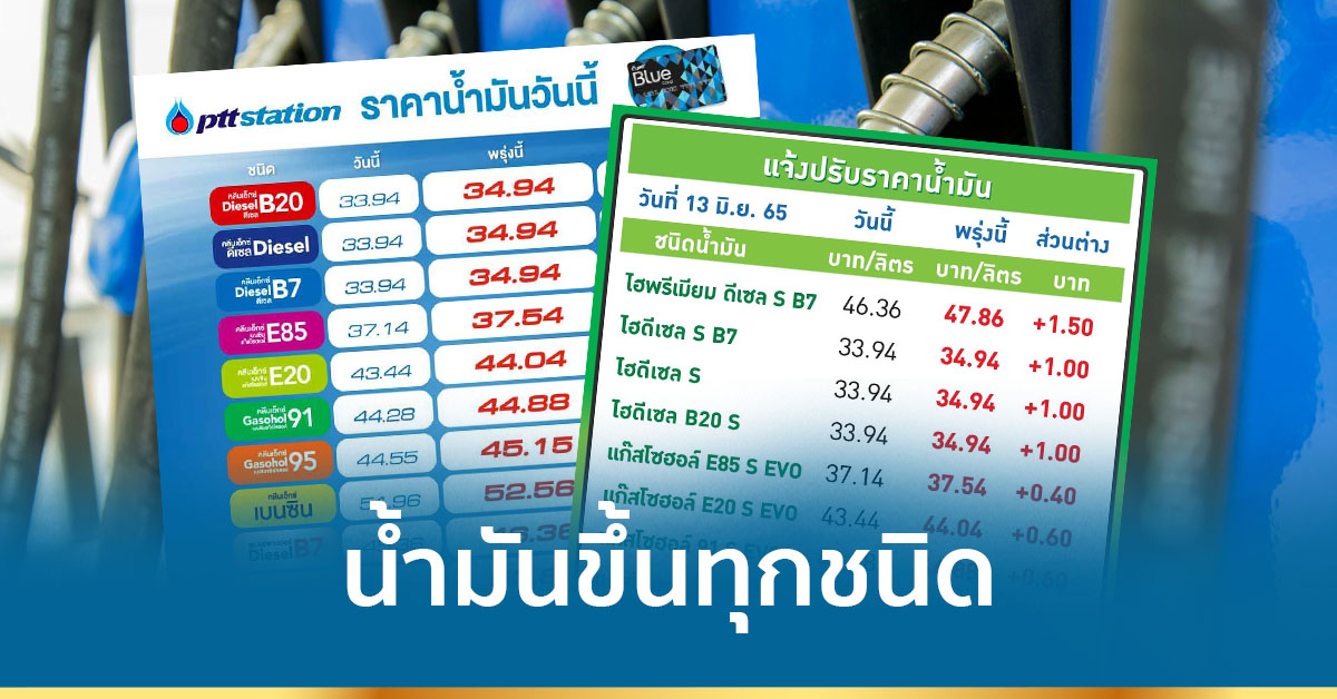 PTT Station ปรับราคาขายปลีกน้ำมันกลุ่มดีเซลทุกชนิดขึ้น 1.00 บาทต่อลิตร ส่วนกลุ่มเบนซินและแก๊สโซฮอล์ทุกชนิด ปรับขึ้น 0.60 บาทต่อลิตร เว้น E85 ปรับขึ้น 0.40 บาทต่อลิตร มีผล 14 มิ.ย.65 เวลา 05.00 น. เป็นต้นไป โดยราคาขายปลีกจะเป็นดังนี้ ULG = 52.56, GSH95 = 45.15, E20 = 44.04, GSH91 = 44.88, E85 = 37.54,พรีเมี่ยม GSH95 = 50.64, HSD- B7= 34.94, HSD-B10 = 34.94, HSD-B20=34.94, ดีเซลพรีเมี่ยม B7 = 46.36 บาทต่อลิตร โดยราคาขายปลีกข้างต้นยังไม่รวมภาษีบำรุงกรุงเทพมหานคร