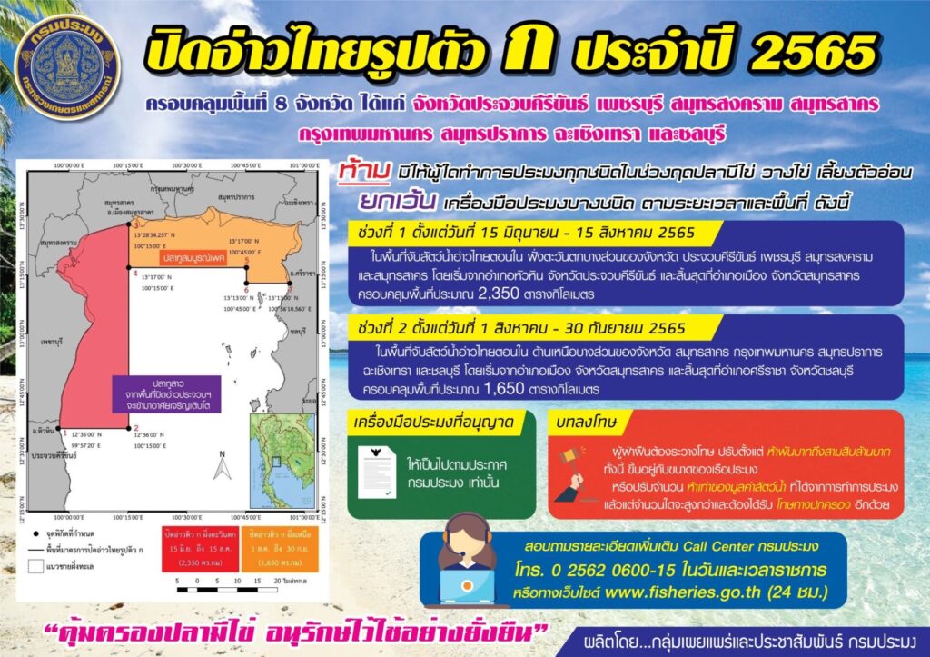 นายเฉลิมชัย สุวรรณรักษ์ อธิบดีกรมประมงกล่าวว่า กรมประมงประกาศใช้มาตรการบริหารจัดการทรัพยากรในช่วงสัตว์น้ำมีไข่ วางไข่ และเลี้ยงตัวอ่อนในทะเลอ่าวไทยตอนใน (อ่าวไทยรูปตัว ก) ประจำปี 2565 ช่วงที่ 1 ตั้งแต่วันที่ 15 มิถุนายน – 15 สิงหาคม และช่วงที่ 2 ตั้งแต่วันที่ 1 สิงหาคม – 30 กันยายน ครอบคลุมพื้นที่ 8 จังหวัด ดังนี้