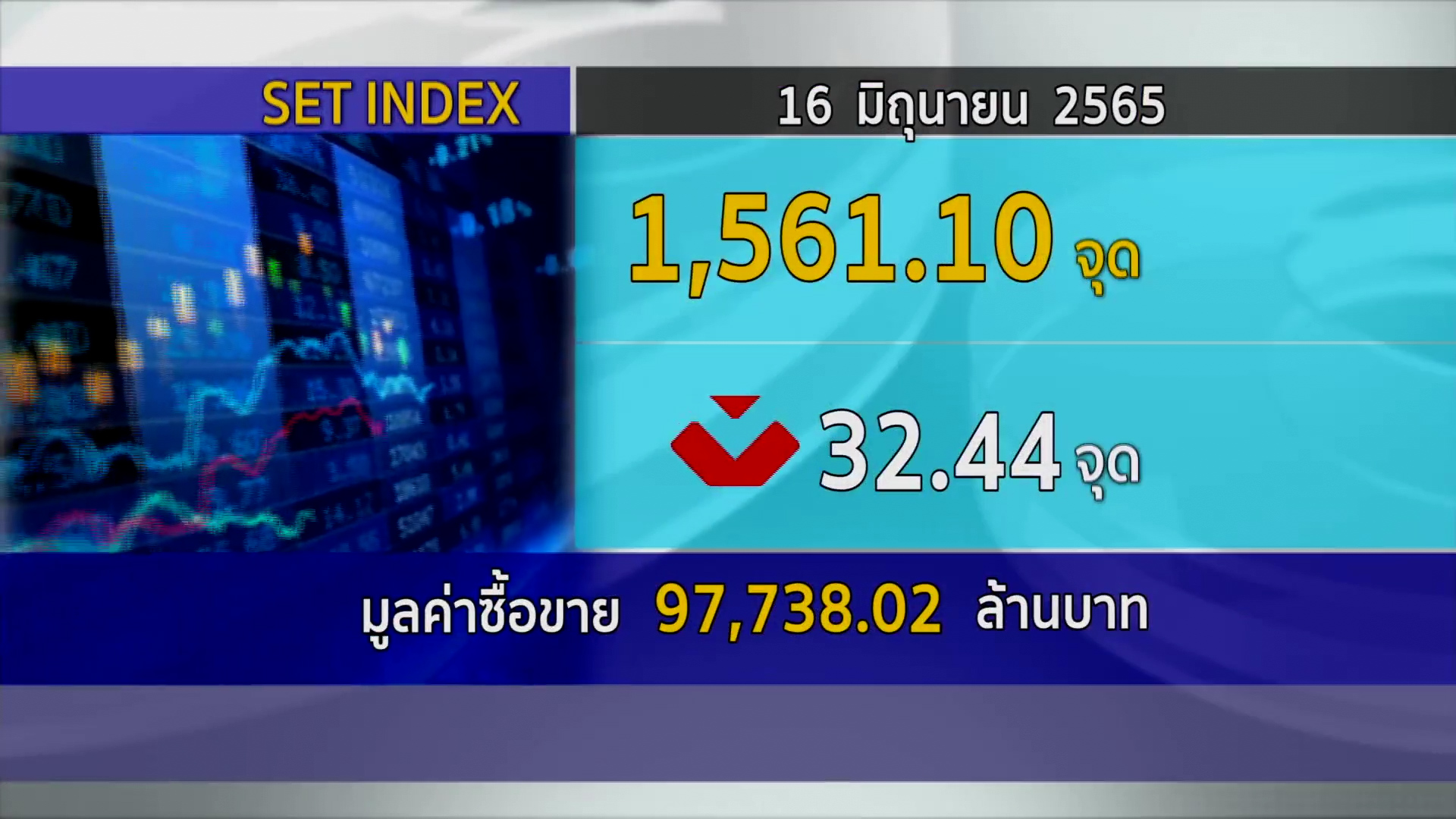 กทม. 16 มิ.ย.- ตลาดหลักทรัพย์ ปิดวันนี้ที่ระดับ 1,561.10 จุด ลดลง 32.44 จุด (-2.04%) มูลค่าการซื้อขาย 97,738.02 ล้านบาท