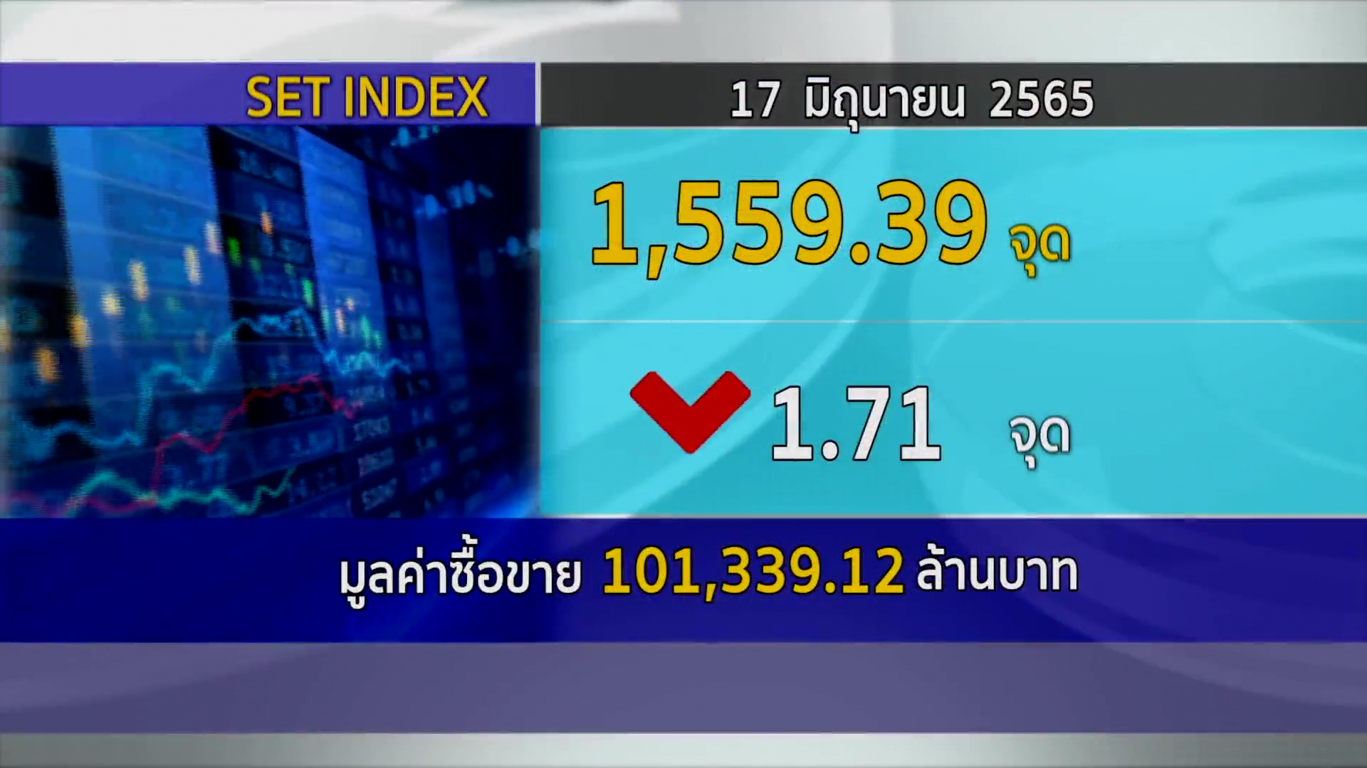 กทม. 17 มิ.ย.- ตลาดหลักทรัพย์ ปิดวันนี้ที่ระดับ 1,559.39 จุด ลดลง 1.71 จุด (-0.11%) มูลค่าการซื้อขาย 101,339.12 ล้านบาท