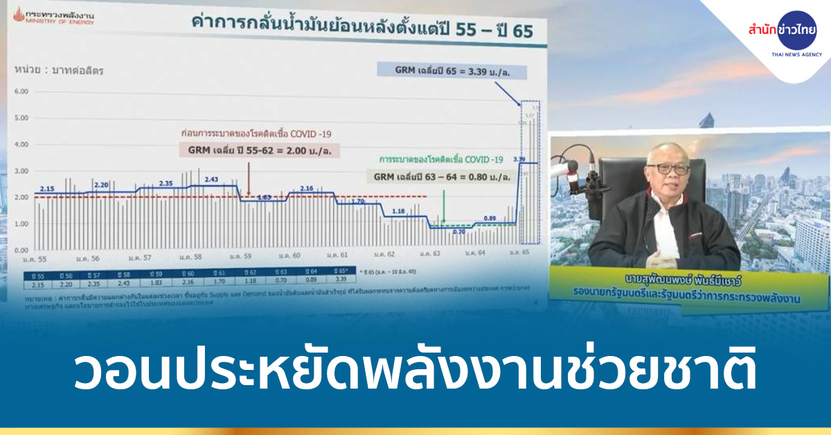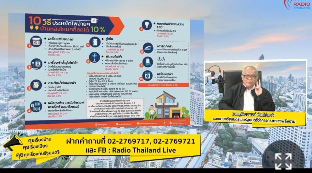 นายสุพัฒนพงษ์ พันธ์มีเชาว์ รองนายกรัฐมนตรีและรัฐมนตรีว่าการกระทรวงพลังงาน กล่าวผ่านรายการวิทยุกรมประชาสัมพันธ์ วอนขอประชาชน เอกชน ร่วมมือภาครัฐ ฝ่าวิกฤติพลังงานแพง โดยการลดกำไรร่วมประหยัด ขณะนี้ให้ภาครัฐลดใช้พลังงาน 20% หากประชาชนลดใช้ไฟฟ้า-น้ำมัน อย่างละ 10% ก็จะช่วยชาติลดต้นทุน 2 แสนล้านบาท