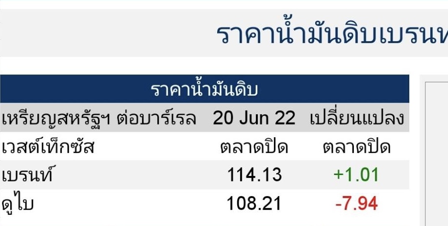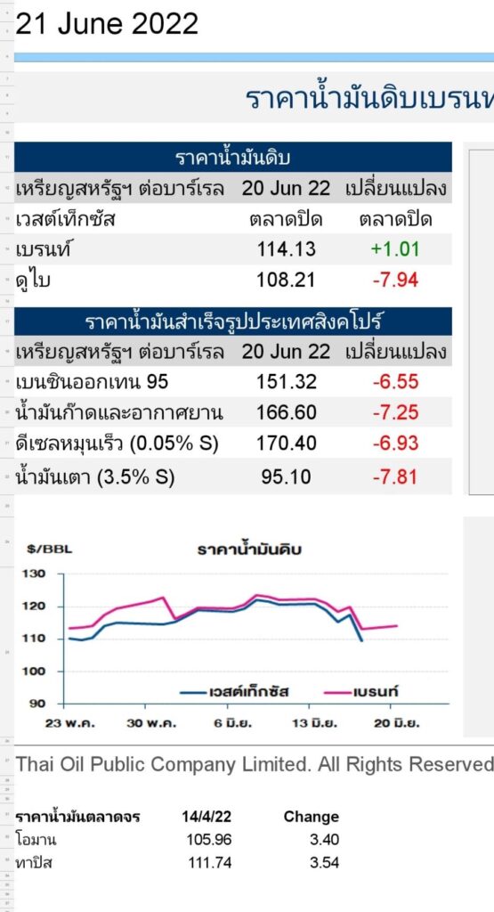 ผู้สื่อข่าวรายงานว่าหลังราคาน้ำมันสำเร็จรูปสิงคโปร์ปรับลดลงถึงราว 6 เหรียญสหรัฐ/บาร์เรลวานนี้ (20 มิ.ย.) เคลื่อนไหวตามราคาน้ำมันฟื้นตัวหลังจากที่ทรุดตัวลงรุนแรงกว่า 6.8% เมื่อวันศุกร์ (17 มิ.ย.) ก็เป็นที่คาดหวังว่าราคาน้ำมันขายปลีกในไทยกลุ่มเบนซินในสัปดาห์นี้ผู้ค้าน้ำมันจะลดลงมาบ้างหลังจากที่ผ่านมาราคาปรับขึ้นมาอยู่ในระดับสูง ในขณะที่ราคาดีเซลในไทยอยู่ที่ประมาณ 35 บาท/ลิตร โดยกองทุนฯ น้ำมันเชื้อเพลิงอุดหนุนราว 11 บาท/ลิตร ราคาสิงคโปร์ปิดวานนี้ เบนซิน ปิดที่ 151.32 เหรียญ/บาร์เรล ลดลง 6.55 เหรียญ ดีเซลปิดที่ 170.40 เหรียญ ลดลง 6.93 เหรียญ ส่วนน้ำมันดิบดูไบ ลดลง 7.94 เหรียญต่อบาร์เรล ปิดที่ 108.21 เหรียญ/บาร์เรล