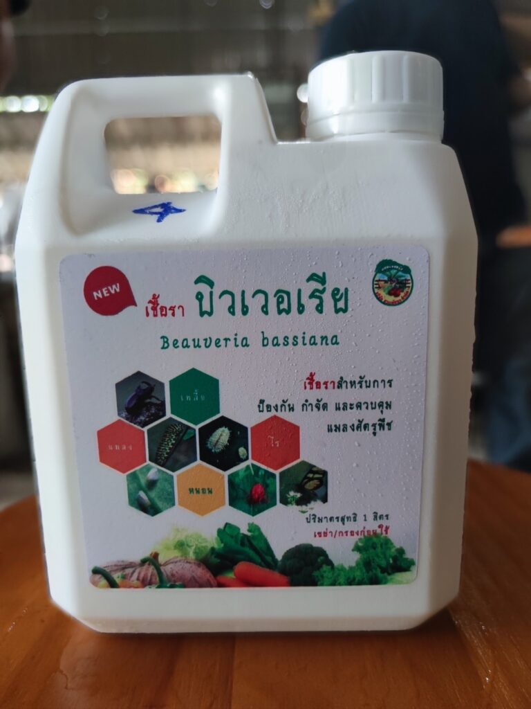 4. ผลิตภัณฑ์เชื้อราบิวเวอเรีย สำหรับป้องกัน กำจัด และควบคุมแมลงศัตรูพืช ขนาดปริมาตร 1 ลิตร บรรจุในกระป๋องพลาสติก ทรงสี่เหลี่ยม สีขาว จำนวน 17 กระป๋อง