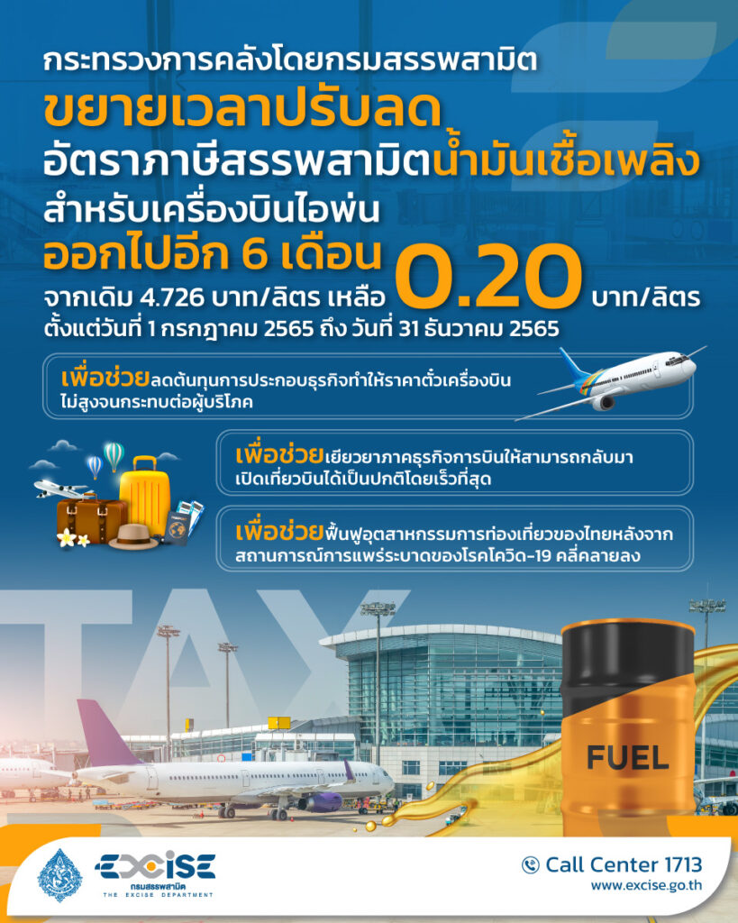 ดร.เอกนิติ นิติทัณฑ์ประภาศ อธิบดีกรมสรรพสามิต เปิดเผยว่า เมื่อวันที่ 21 มิถุนายน 2565 คณะรัฐมนตรีได้มีมติเห็นชอบตามข้อเสนอของกระทรวงการคลังขยายเวลาการปรับลดอัตราภาษีสรรพสามิตน้ำมันเชื้อเพลิงสำหรับเครื่องบินไอพ่นที่ใช้ในประเทศเหลือลิตรละ 0.20 บาท ออกไปจนถึงวันที่ 31 ธันวาคม 2565 เพื่อสนับสนุนอุตสาหกรรมท่องเที่ยวของไทยให้ช่วยขับเคลื่อนเศรษฐกิจของประเทศให้กลับมาขยายตัวได้อย่างต่อเนื่อง