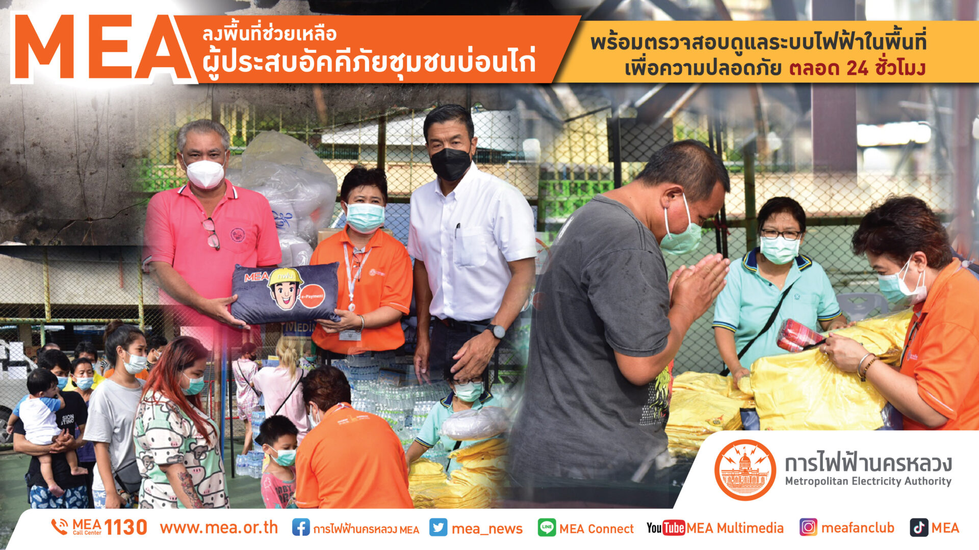 ชุมชนบ่อนไก่ 22 มิ.ย.- MEA ลงพื้นที่ช่วยเหลือผู้ประสบอัคคีภัยชุมชนบ่อนไก่ พร้อมตรวจสอบดูแลระบบไฟฟ้าในพื้นที่ เพื่อความปลอดภัย ตลอด 24 ชั่วโมง