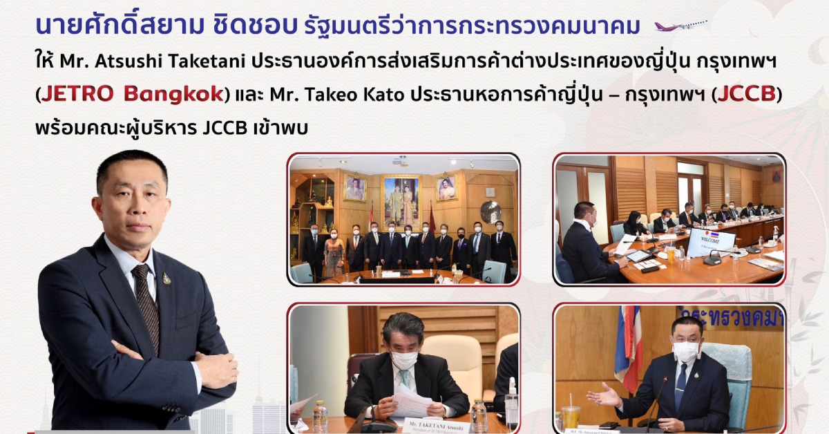 นายศักดิ์สยาม ชิดชอบ รัฐมนตรีว่าการกระทรวงคมนาคม (คค.) ให้ Mr. Atsushi Taketani ประธานองค์การส่งเสริมการค้าต่างประเทศของญี่ปุ่น กรุงเทพฯ (JETRO Bangkok) และ Mr. Takeo Kato ประธานหอการค้าญี่ปุ่น – กรุงเทพฯ (JCCB) พร้อมคณะผู้บริหาร JCCB เข้าพบ เพื่ออำลาในโอกาสที่ Mr. Mr. Atsushi Taketani จะพ้นจากหน้าที่และร่วมหารือพัฒนาแนวทางในการสนับสนุนการดำเนินการภาคธุรกิจของภาคเอกชนญี่ปุ่นในประเทศไทย โดยมีนายวิรัช พิมพะนิตย์ ที่ปรึกษารัฐมนตรีว่าการกระทรวงคมนาคม นางสุขสมรวย วัทนียกุล เลขานุการรัฐมนตรีว่าการกระทรวงคมนาคม นายชยธรรม์ พรหมศร ปลัดกระทรวงคมนาคม นายปัญญา ชูพานิช ผู้อำนวยการสำนักงานนโยบายและแผนการขนส่งและจราจร ร่วมหารือ
