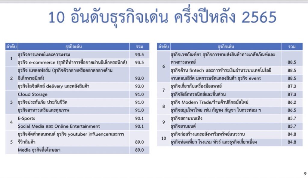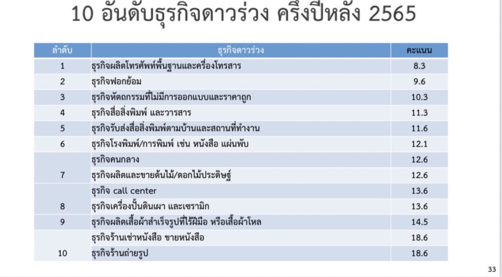 อย่างไรก็ตาม นอกจาก 10 ธุรกิจเด่นในครึ่งปี 65 แล้ว ในส่วน 10 ธุรกิจดาวร่วงในครึ่งปีหลัง จะประกอบด้วย