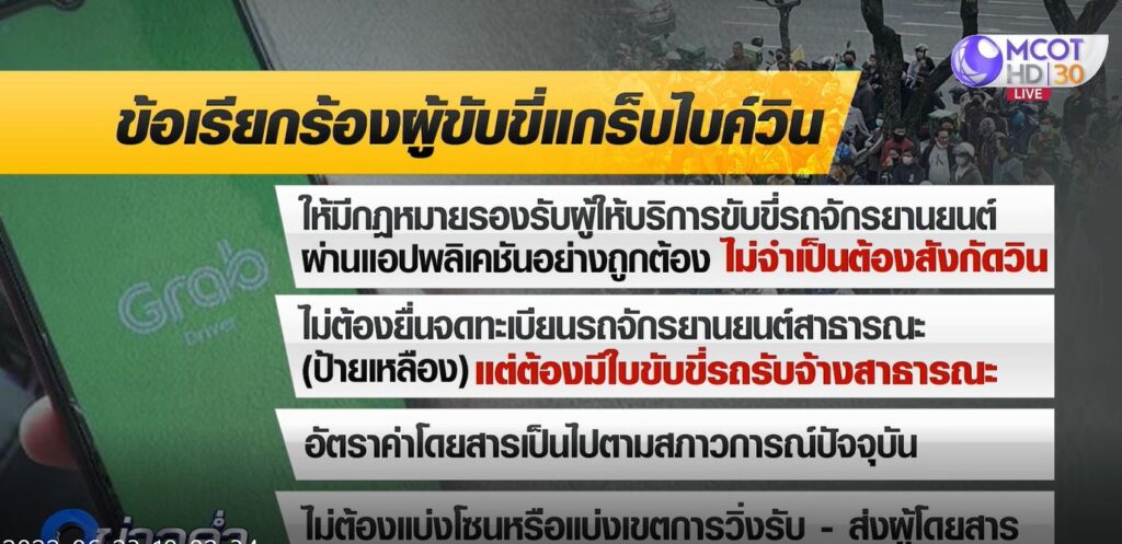 ขอให้มีกฎหมายรองรับผู้ให้บริการขับขี่รถจักรยานยนต์ผ่านแอปพลิเคชันอย่างถูกต้อง โดยมีเงื่อนไขคือ ไม่จำเป็นต้องมีสังกัดวิน เนื่องจากเสื้อวินมีราคาสูง และหากให้ไปรวมกับวินที่มีอยู่แล้ว อาจก่อให้เกิดปัญหาความขัดแย้งระหว่างวินและผู้ให้บริการขับขี่รถมากยิ่งขึ้น